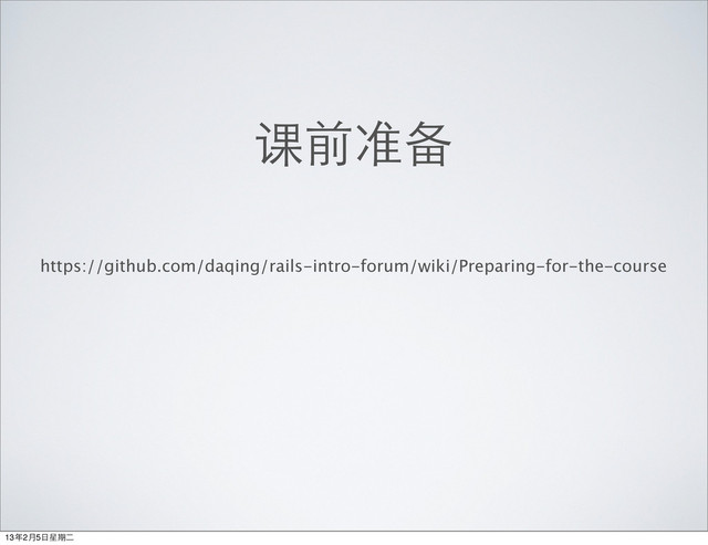 课前准备 https://github.com/daqing/rails-intro-forum/wiki/Preparing-for-the-course 13年2月5⽇日星期⼆二