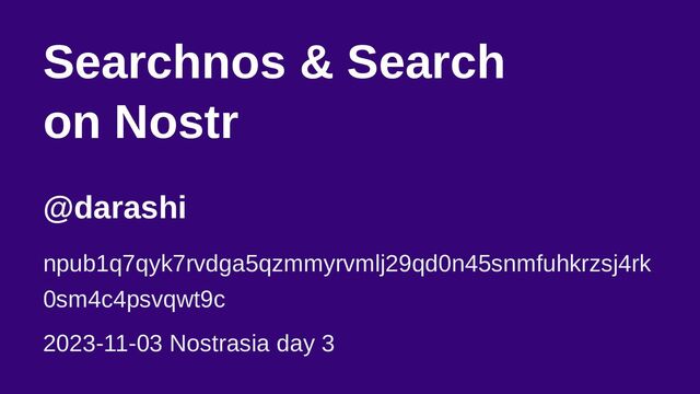 Searchnos & Search on Nostr @darashi npub1q7qyk7rvdga5qzmmyrvmlj29qd0n45snmfuhkrzsj4rk 0sm4c4psvqwt9c 2023-11-03 Nostrasia
