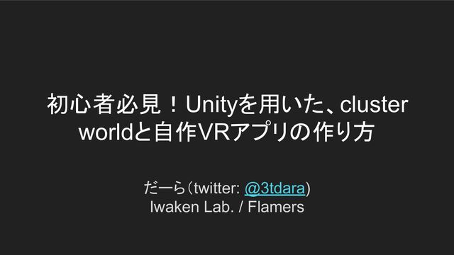 初心者必見!Unityを用いた、cluster worldと自作VRアプリの作り方 だーら(twitter: @3tdara) Iwaken Lab. / Flamers