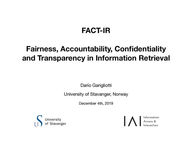 (recently co- located with the SIGIR 2019 Conference): - FACTS-IR 2019 Workshop on fairness, accountability, confidentiality, transparency, and safety in IR - EARS 2019 - The 2nd International Workshop on ExplainAble Recommendation and Search - NewsIR'19 - 3rd International Workshop on Recent Trends in News Information Retrieval 43