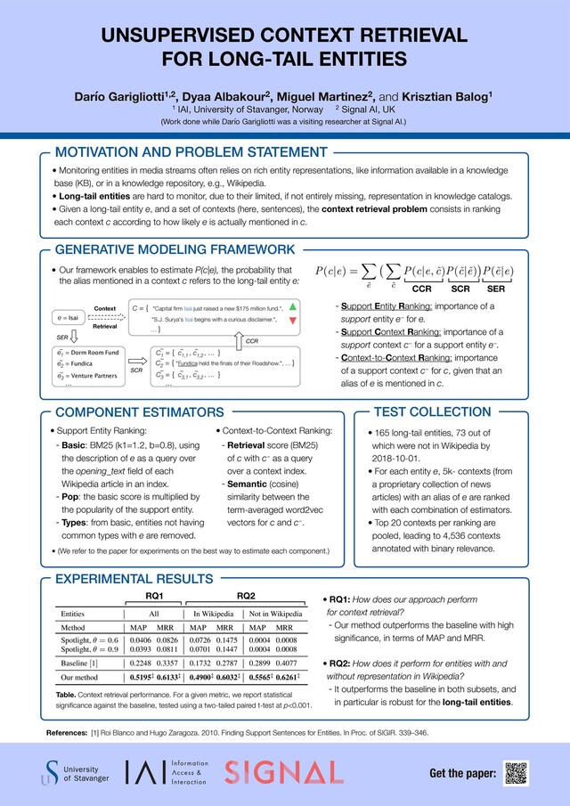 Miguel Martinez2, and Krisztian Balog1 1 IAI, University of Stavanger, Norway 2 Signal AI, UK (Work done while Darío Garigliotti was a visiting researcher at Signal AI.) Get the paper: References: [1] Roi Blanco and Hugo Zaragoza. 2010. Finding Support Sentences for Entities. In Proc. of SIGIR. 339–346. • 165 long-tail entities, 73 out of which were not in Wikipedia by 2018-10-01. • For each entity e, 5k- contexts (from a proprietary collection of news articles) with an alias of e are ranked with each combination of estimators. • Top 20 contexts per ranking are pooled, leading to 4,536 contexts annotated with binary relevance. TEST COLLECTION • Monitoring entities in media streams often relies on rich entity representations, like information available in a knowledge base (KB), or in a knowledge repository, e.g., Wikipedia. • Long-tail entities are hard to monitor, due to their limited, if not entirely missing, representation in knowledge catalogs. • Given a long-tail entity e, and a set of contexts (here, sentences), the context retrieval problem consists in ranking each context c according to how likely e is actually mentioned in c. MOTIVATION AND PROBLEM STATEMENT GENERATIVE MODELING FRAMEWORK - Support Entity Ranking: importance of a support entity e~ for e. - Support Context Ranking: importance of a support context c~ for a support entity e~. - Context-to-Context Ranking: importance of a support context c~ for c, given that an alias of e is mentioned in c. P(c|e) = X ˜ e X ˜ c P(c|e,˜ c)P(˜ c|˜ e) P(˜ e|e) CCR SCR SER • Our framework enables to estimate P(c|e), the probability that the alias mentioned in a context c refers to the long-tail entity e: Context Retrieval SCR SER ~ e 1 = Dorm Room Fund ~ e 2 = Fundica ~ e 3 = Venture Partners … … ~ C 2 = { "Fundica held the finals of their Roadshow.", … } ~ C 3 = { c 3,1 , c 3,2 , … } ~ ~ ~ C 1 = { c 1,1 , c 1,2 , … } ~ ~ e = Isai "Capital firm Isai just raised a new $175 million fund.", "S.J. Surya's Isai begins with a curious disclaimer.", C = { … } CCR • RQ1: How does our approach perform for context retrieval? - Our method outperforms the baseline with high significance, in terms of MAP and MRR. • RQ2: How does it perform for entities with and without representation in Wikipedia? - It outperforms the baseline in both subsets, and in particular is robust for the long-tail entities. EXPERIMENTAL RESULTS Entities All In Wikipedia Not in Wikipedia Method MAP MRR MAP MRR MAP MRR Spotlight, ✓ = 0.6 0.0406 0.0826 0.0726 0.1475 0.0004 0.0008 Spotlight, ✓ = 0.9 0.0393 0.0811 0.0701 0.1447 0.0004 0.0008 Baseline [1] 0.2248 0.3357 0.1732 0.2787 0.2899 0.4077 Our method 0.5195‡ 0.6133‡ 0.4900‡ 0.6032‡ 0.5565‡ 0.6261‡ Table. Context retrieval performance. For a given metric, we report statistical significance against the baseline, tested using a two-tailed paired t-test at p<0.001. RQ1 RQ2 - Retrieval score (BM25) of c with c~ as a query over a context index. - Semantic (cosine) similarity between the term-averaged word2vec vectors for c and c~. • Context-to-Context Ranking: • Support Entity Ranking: - Basic: BM25 (k1=1.2, b=0.8), using the description of e as a query over the opening_text field of each Wikipedia article in an index. - Pop: the basic score is multiplied by the popularity of the support entity. - Types: from basic, entities not having common types with e are removed. COMPONENT ESTIMATORS • (We refer to the paper for experiments on the best way to estimate each component.)