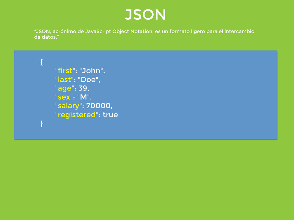 "salary": 70000, "registered": true } “JSON, acrónimo de JavaScript Object Notation, es un formato ligero para el intercambio de datos.”