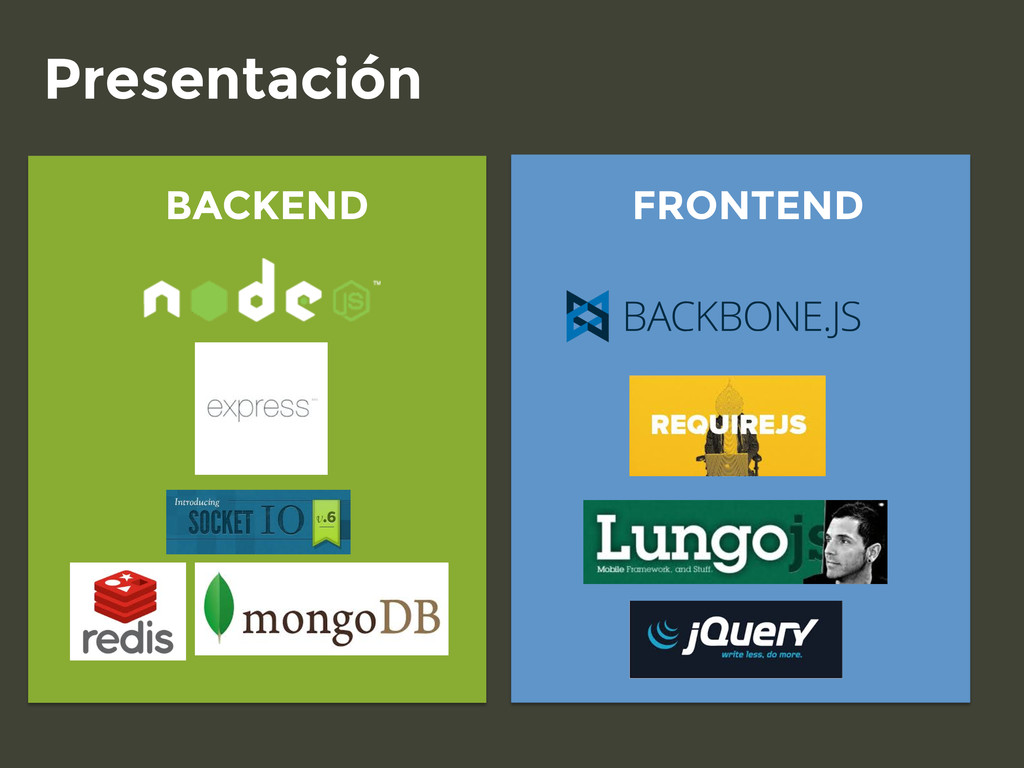 BACKEND json ExpressJs MongoDB REDIS Backbone RequireJS FRONTEND Underscore JQuery