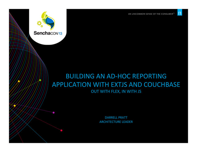 TECHNOLOGY STACK • UI built on Ext JS 4.2.0 • Extensive use of MVC Architecture • De\ JS used for managing mulSple instances of same views ,IOC, Promises • AM Charts used for charSng • D3 used in some edge case chart types • AM Charts used as we had experience with it on Flex applicaSon • Middle Ser composed of Spring MVC and Spring IOC • JSON REST endpoints through configuraSon • XML to JSON conversion where needed • Report Player using Ext Direct • SOA Tier using Tibco AMX 3.2 • Couchbase 2.x – Storage, Caching and Search • Hudson, ArSfactory, Gradle, Jasmine, JS Duck