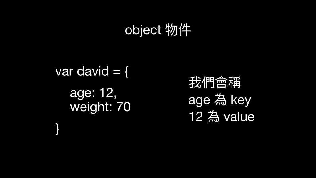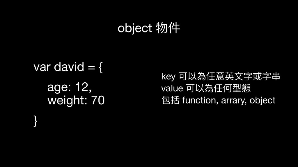 } key 可以為任意英⽂字或字串 value 可以為任何型態 包括 function, arrary, object