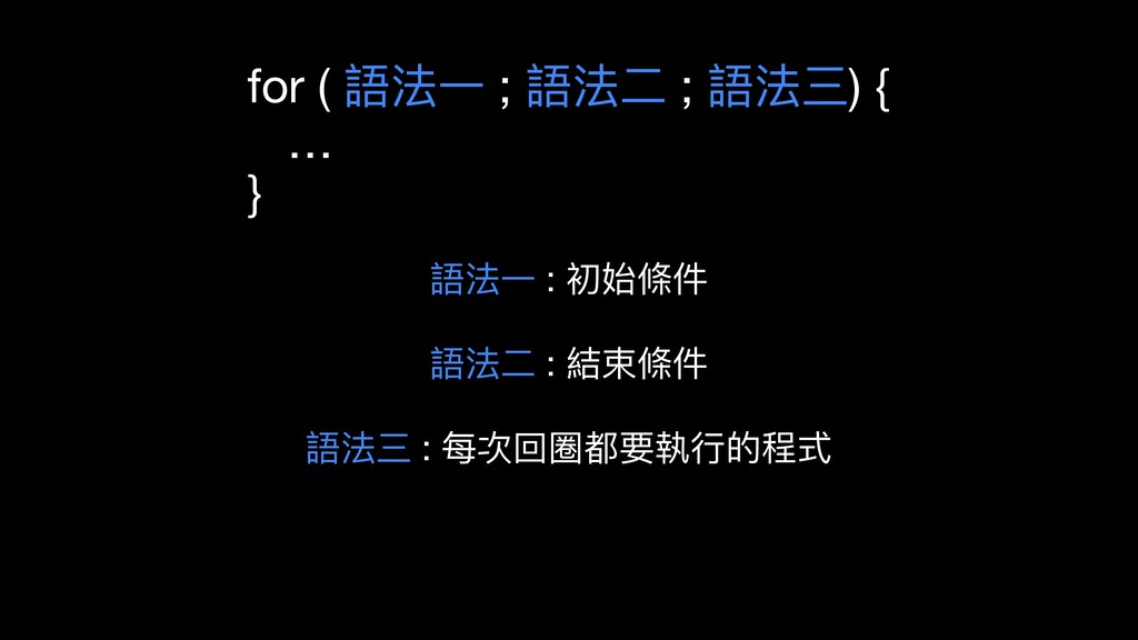 語法⼀ : 初始條件 語法⼆ : 結束條件 語法三 : 每次回圈都要執⾏的程式