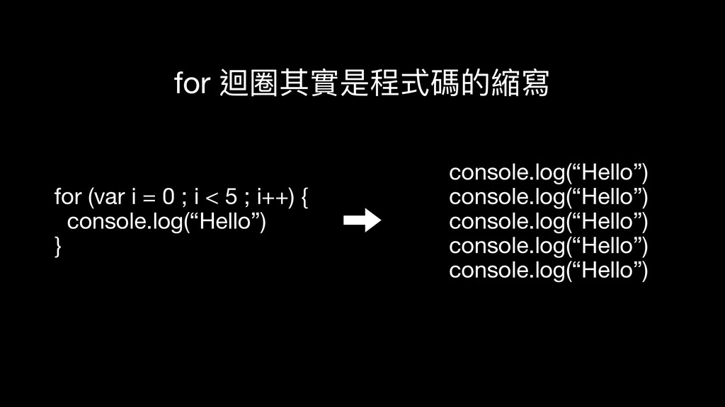 for 迴圈其實是程式碼的縮寫 for (var i = 0 ; i <
