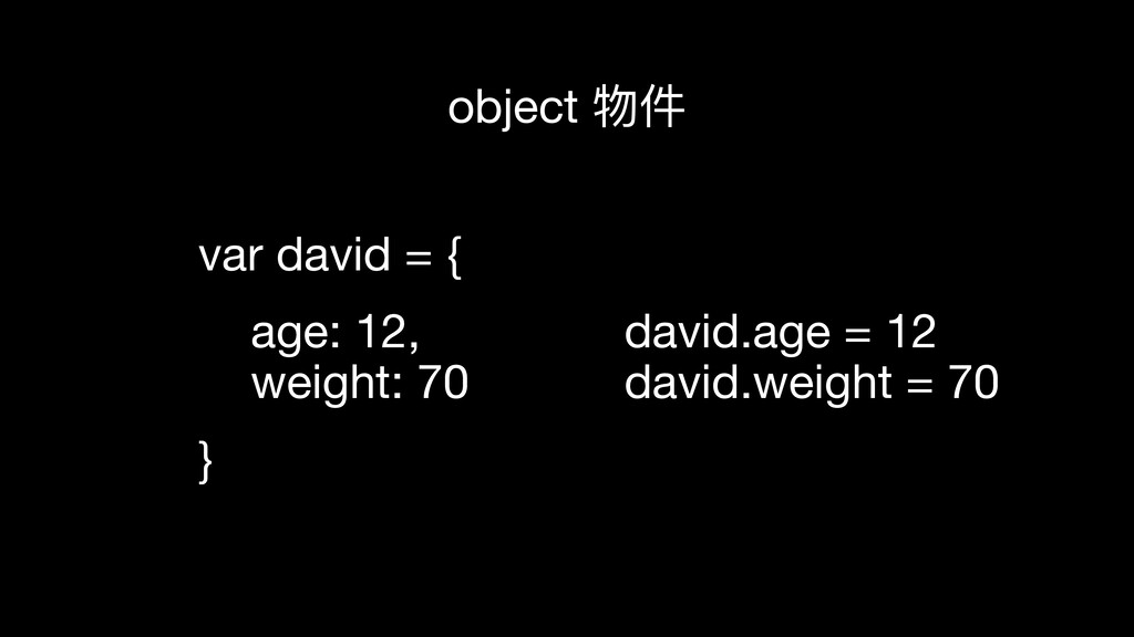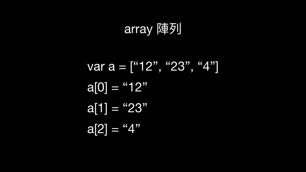 array 陣列 var a = [“12”, “23”, “4”] a[0] =