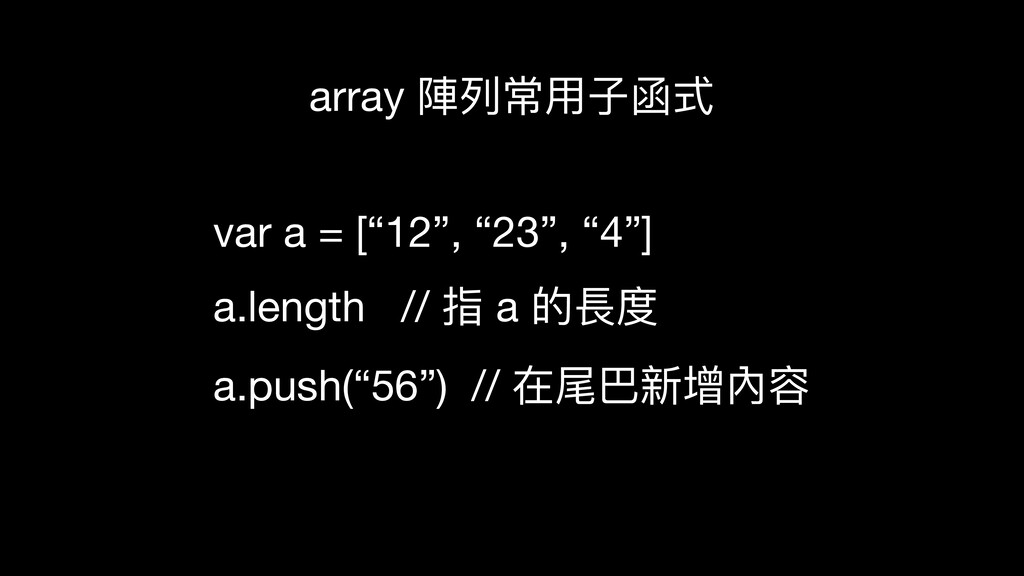 array 陣列常⽤⼦函式 var a = [“12”, “23”, “4”] a.length //