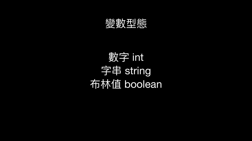 變數型態 數字 int 字串 string 布林值 boolean