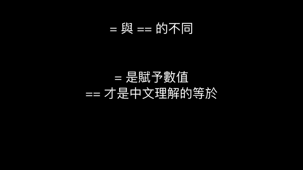 = 與 == 的不同 = 是賦予數值 == 才是中⽂理解的等於