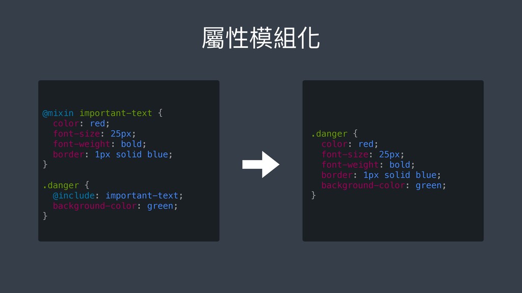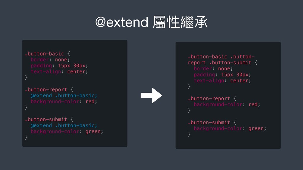 center; } .button-report { @extend .button-basic; background-color: red; } .button-submit { @extend .button-basic; background-color: green; } .button-basic .button- report .button-submit { border: none; padding: 15px 30px; text-align: center; } .button-report { background-color: red; } .button-submit { background-color: green; }