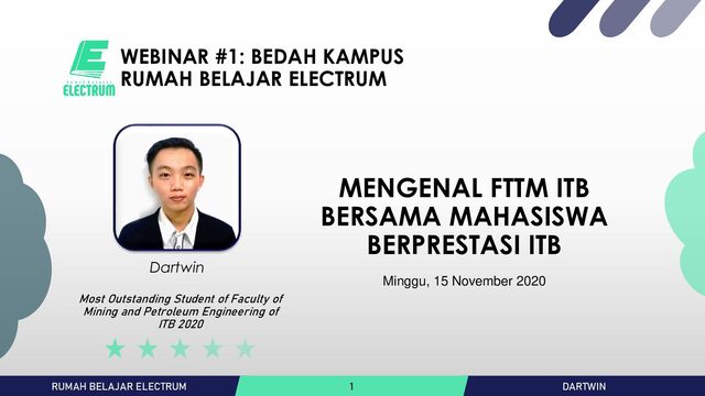 of International Engineering Student Conference 2020 • First Champion of Metallurgy & Material Challenge 2020 • First Champion of Metallurgy & Material Challenge 2019 • First Winner of Indonesian Student Mining Competition XI 2018 • First Winner of Paper Competition of Advancing Indonesia's Energy with Geophysics 2018 • First Winner of Mud Innovation of Integrated Petroleum Festival 2018 • etc. Dosen • Irwan Iskandar, S.T., M.T., Ph.D. - Bidang Karya Inovasi Tahun 2016 • Prof., Dr., Ir., Ridho Kresna Wattimena, M.T. - Bidang Karya Inovasi Tahun 2016 • Ir., Teti Indriati, M.T - Satyalancana Karya Satya XX Tahun 2016 • Dr.phil.nat., Agus Haris Widayat, S.T., M.T. - Best Poster Award in International Symposium on Earth Science and Technology 2015 • Dr., Ir., R. Budi Sulistijo, M.App.Sc. - Program Riset Desentralisasi DIKTI 2015 • Prof., Dr., Ir., Budi Sulistianto, M.T. - Bidang Karya Inovasi Tahun 2015 • etc. DARTWIN 8 Sumber: https://www.fttm.itb.ac.id/prestasi-2/