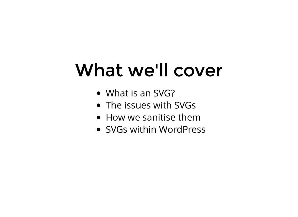 In this talk I aim to explore some of the main issues that surround SVG uploads and why we’ve not seen this feature in WordPress yet. We’ll also look into why they need to be sanitised and the problems that can occur if we don’t properly secure them.