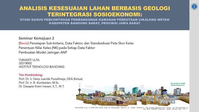 Y., Jia, T. Y., Che Yaziz, A. M., Irawan, D. E., dan Puradimaja, D. J. (2021): Between natural and anthropogenic coastal landforms: insights from ground penetrating radar and sediment analysis, Applied Sciences, 11, 3449. https://doi.org/10.3390/app11083449. Irawan, D. E., Ulfa, Y., Prabowo, R. M., Kombaitan, B., & Puradimaja, D. J. (2021). Discovering research trends of urban geology based on a bibliometric analysis. F1000Research, 10(839), 839. https://doi.org/10.12688/f1000research.53948.1 PROSIDING (TERBIT) Ulfa, Y., Irawan, D. E., Furqan, A., Kombaitan, B., dan Puradimaja, D. J. (2019): Urban geology in Indonesia: An overview, Prosiding Yogyakarta Joint Convention 2019, HAGI-IAGI-IAFMI-IATMI, Yogyakarta, 25 – 28 Nov. https://www.researchgate.net/profile/Yuniarti-Ulfa- 2/publication/340084599_Urban_geology_in_Indonesia_an_overview/lin ks/5e76556b92851cf2719d8a76/Urban-geology-in-Indonesia-an- overview.pdf Ulfa, Y., Irawan, D. E., Puradimaja, D.J., dan Kombaitan, B. (2019): Analisis bibliometrik terhadap penelitian geologi untuk tata guna lahan perkotaan: 1950-2019, Prosiding Simposium Nasional Inovasi dan Pembelajaran Sains-SNIPS 2019, Program Studi Fisika - FMIPA ITB, Bandung, pp 97-108. https://ifory.id/proceedings/2019/u64ezMhKJ/snips_2019_yuniarti_ulfa_ cfsv2ewdfg.pdf PAPARAN DI SEMINAR INTERNASIONAL Ulfa, Y., Prabowo, R.M., Puradimaja, D.J., Irawan, D.E., dan Kombaitan, B. (2020): The concept of art in thematic-geological map: finding informative-like visualization for public. Proceeding of 2nd International Conference on Art, Science, Technology, and Humanities-ARTESH 2020, p. 49 Bandung, 30 Nov – 2 Des. http://repository.upi-yai.ac.id/2272/1/Proceeding Abstract 2nd IC ARTRESH 2020.pdf PROSIDING (ACCEPTED) Ulfa, Y., Puradimaja, D.J., Irawan, D.E., Prabowo, R.M., dan Kombaitan, B. (2022): Incorporating geology and socio-economic in land management decision: A case study in Walini’s new urban area. Proceeding of PIT-IAGI 5st, Makassar, 24 – 27 Okt. JURNAL NASIONAL (SUBMITTED) Ulfa, Y., Puradimaja, D.J., Irawan, D.E., Prabowo, R.M., dan Kombaitan, B. (2022): Aspek geologi dalam penataan ruang: Sebuah tinjauan yuridis (Jurnal Geologi dan Sumberdaya Mineral) Puradimaja, D.J., Ulfa, Y., Irawan, D.E., Prabowo, R.M., dan Kombaitan, B. (2022): Geology and spatial multi-criteria evaluation model: A new approach (Jurnal Riset Geologi dan Pertambangan) FINAL DRAFT Ulfa, Y., Setiawan, T. , Irawan, D. E., Prabowo, R.M., Purwoarminta, A., Jati, S.N., Puradimaja, D. J., dan Kombaitan, B. (draft): Hydrogeological and hydrogeochemical properties of aquifers system in the Walini urban Area, West Java, Indonesia and their impact on development plans