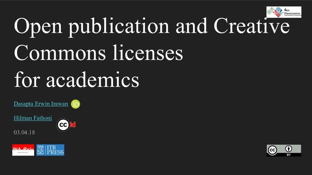 works or source of the usage. • To remind user that they are obliged to give proper attribution. 39 CC licenses BY (Atribution) Obligation to attribute author/source in every works usage. Obligation to explain changes when it’s applied.