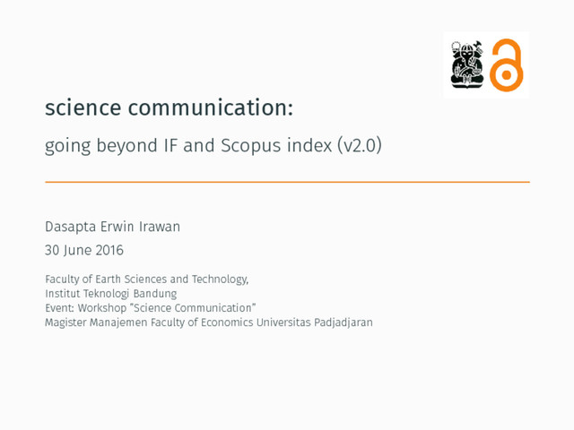 Erwin Irawan 30 June 2016 Faculty of Earth Sciences and Technology, Institut Teknologi Bandung Event: Workshop ”Science Communication” Magister Manajemen Faculty of Economics Universitas Padjadjaran