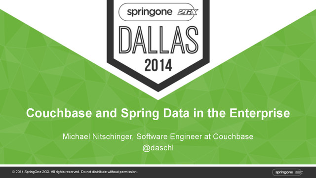 This talk was given at SpringOne 2GX 2014 in Dallas. It introduces Couchbase, then shows how the SDKs are used and finally does a live demo of the module. Note that there are not much slides to spring data in here because those parts have been covered extensively in other sessions of the conference.