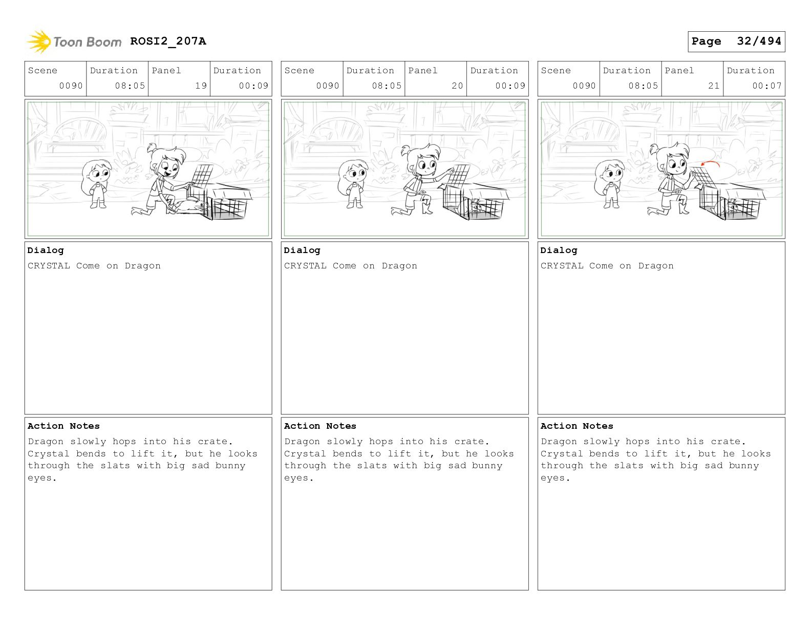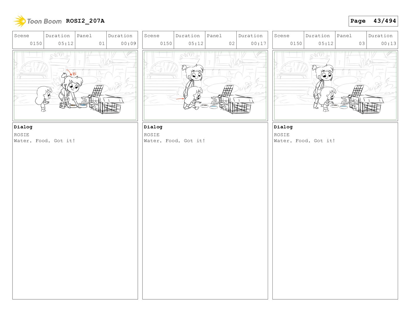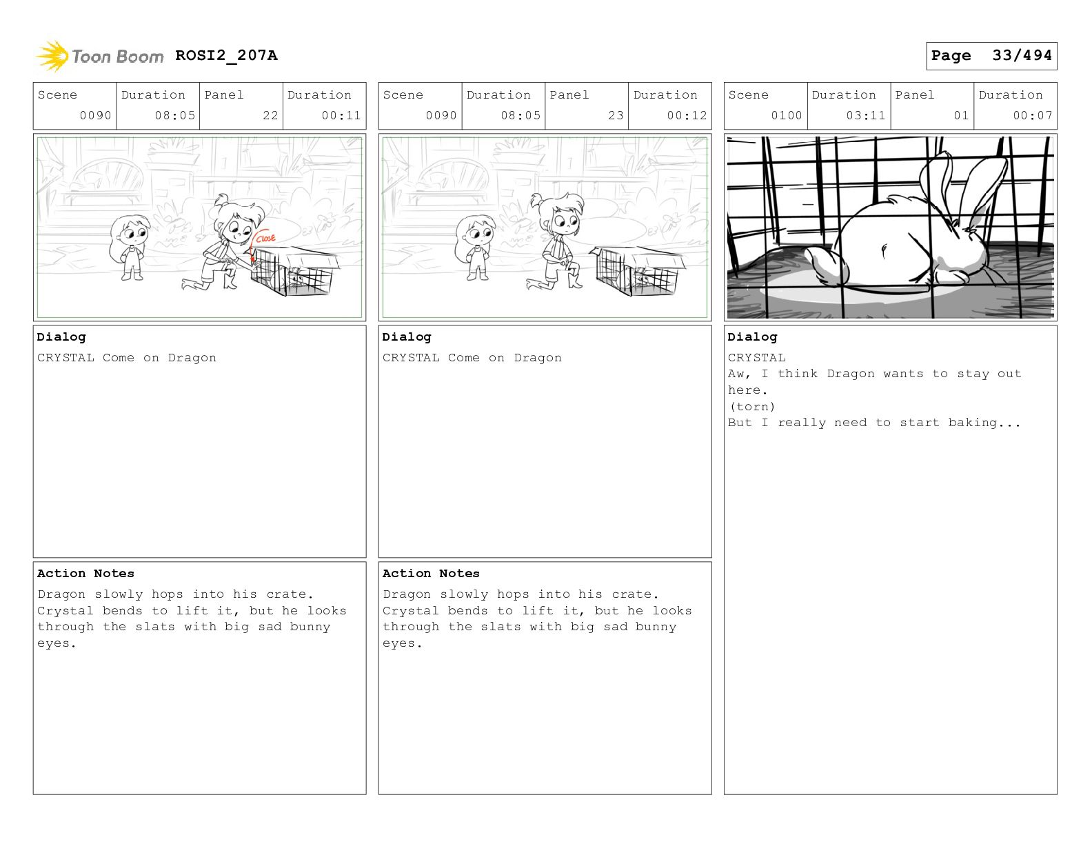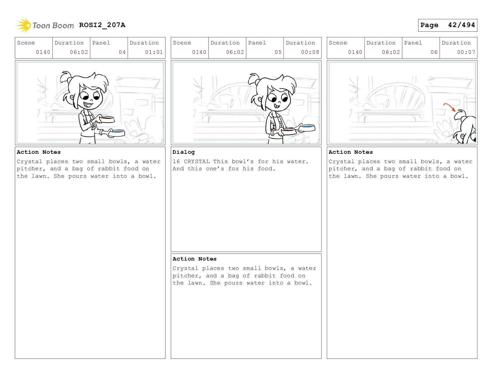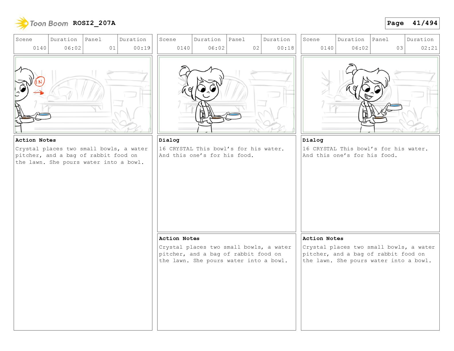 Crystal places two small bowls, a water pitcher, and a bag of rabbit food on the lawn. She pours water into a bowl. Scene 0140 Duration 06:02 Panel 02 Duration 00:18 Dialog 16 CRYSTAL This bowl’s for his water. And this one’s for his food. Action Notes Crystal places two small bowls, a water pitcher, and a bag of rabbit food on the lawn. She pours water into a bowl. Scene 0140 Duration 06:02 Panel 03 Duration 02:21 Dialog 16 CRYSTAL This bowl’s for his water. And this one’s for his food. Action Notes Crystal places two small bowls, a water pitcher, and a bag of rabbit food on the lawn. She pours water into a bowl. ROSI2_207A Page 41/494