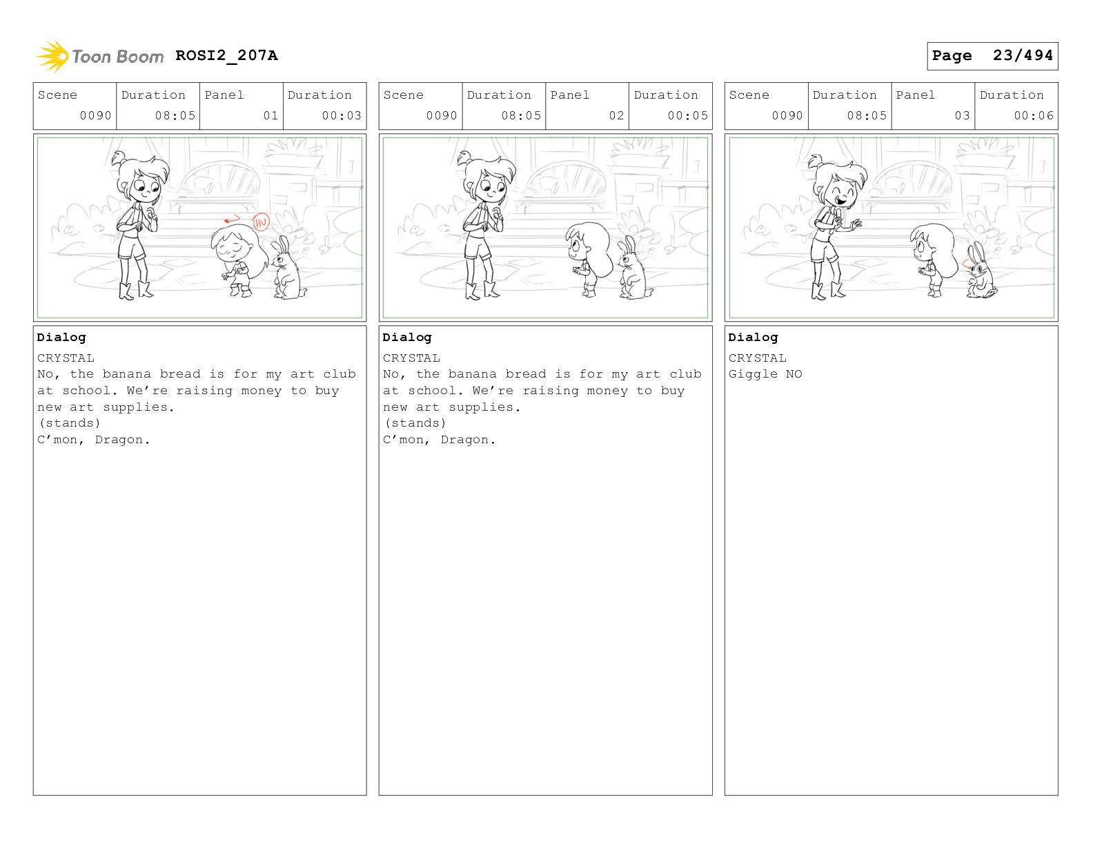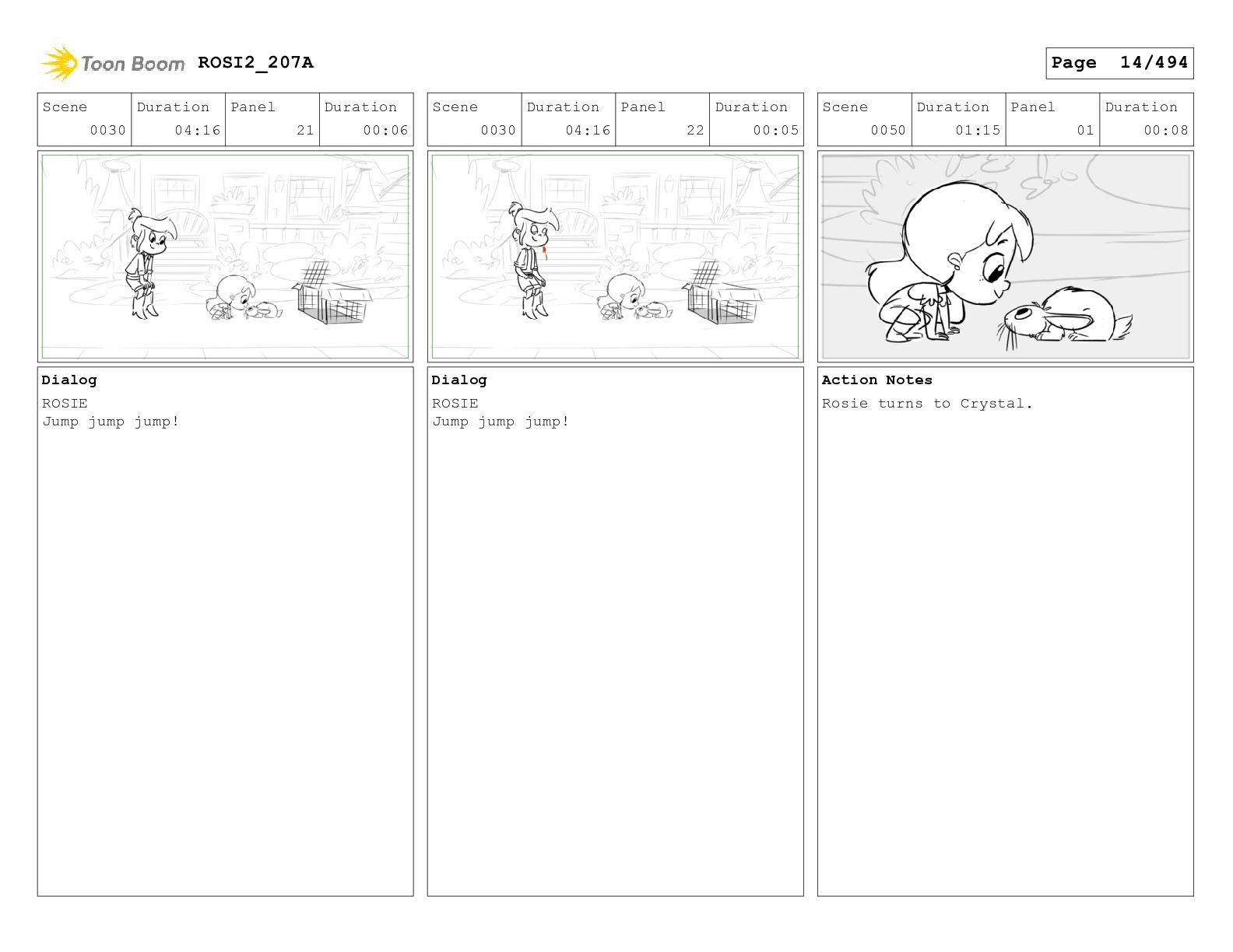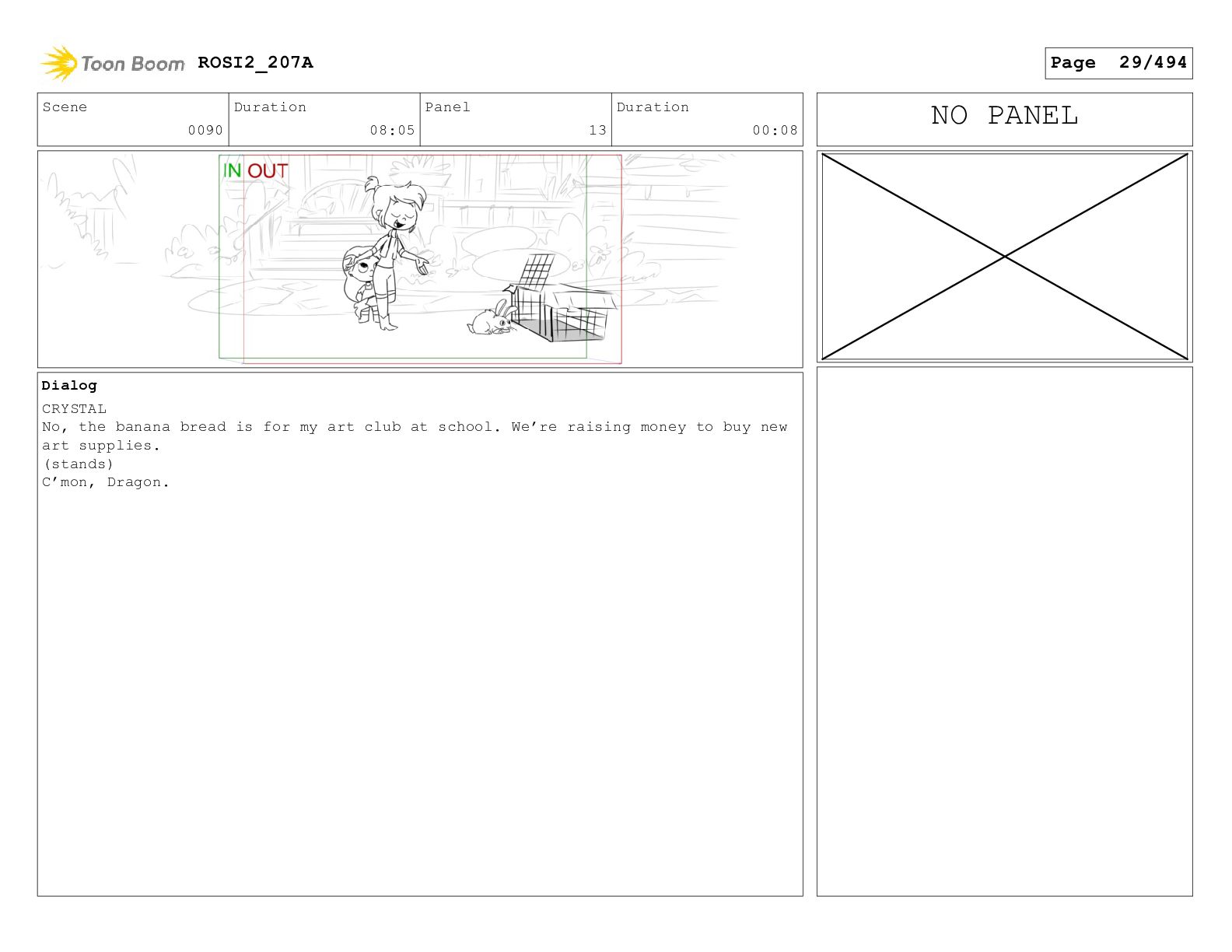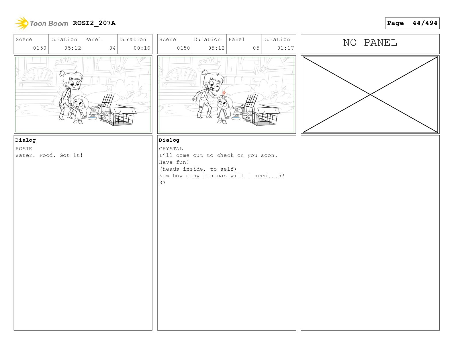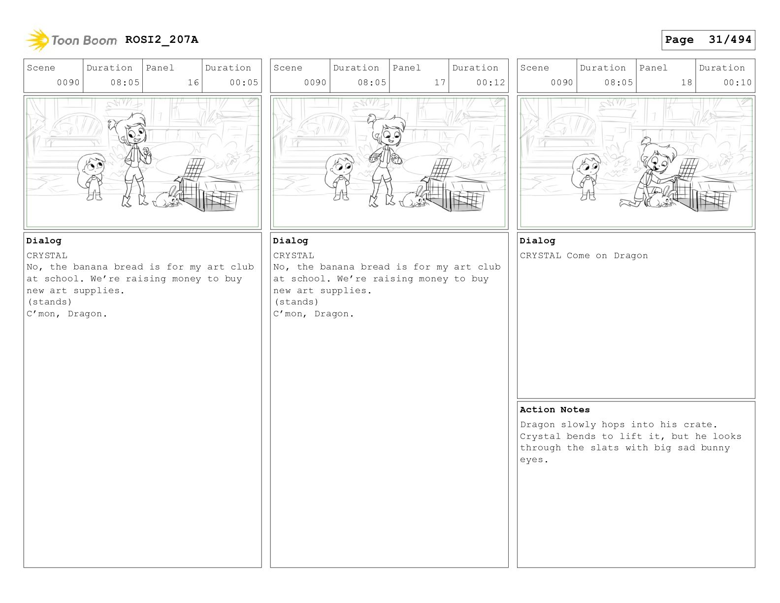 Crystal places two small bowls, a water pitcher, and a bag of rabbit food on the lawn. She pours water into a bowl. Scene 0140 Duration 06:02 Panel 02 Duration 00:18 Dialog 16 CRYSTAL This bowl’s for his water. And this one’s for his food. Action Notes Crystal places two small bowls, a water pitcher, and a bag of rabbit food on the lawn. She pours water into a bowl. Scene 0140 Duration 06:02 Panel 03 Duration 02:21 Dialog 16 CRYSTAL This bowl’s for his water. And this one’s for his food. Action Notes Crystal places two small bowls, a water pitcher, and a bag of rabbit food on the lawn. She pours water into a bowl. ROSI2_207A Page 41/494