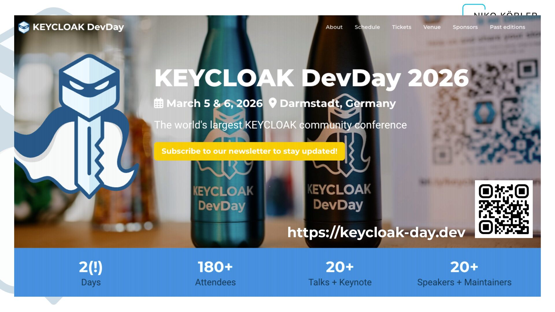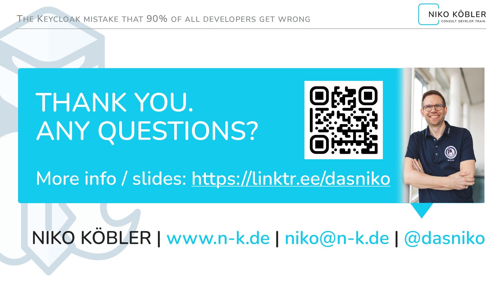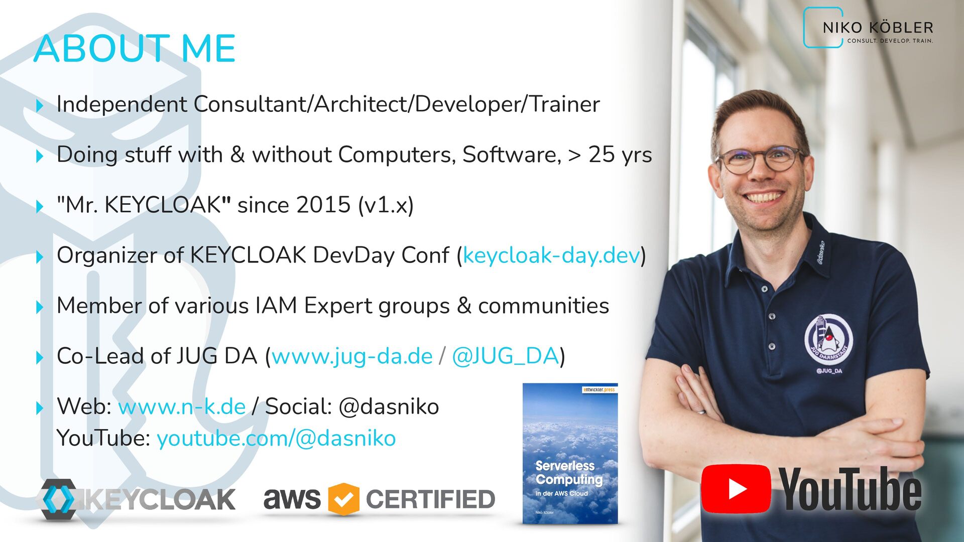 without Computers, Software, > 25 yrs ▸ "Mr. KEYCLOAK" since 2015 (v1.x) ▸ Organizer of KEYCLOAK DevDay Conf (keycloak-day.dev) ▸ Member of various IAM Expert groups & communities ▸ Co-Lead of JUG DA (www.jug-da.de / @JUG_DA) ▸ Web: www.n-k.de / Social: @dasniko YouTube: youtube.com/@dasniko