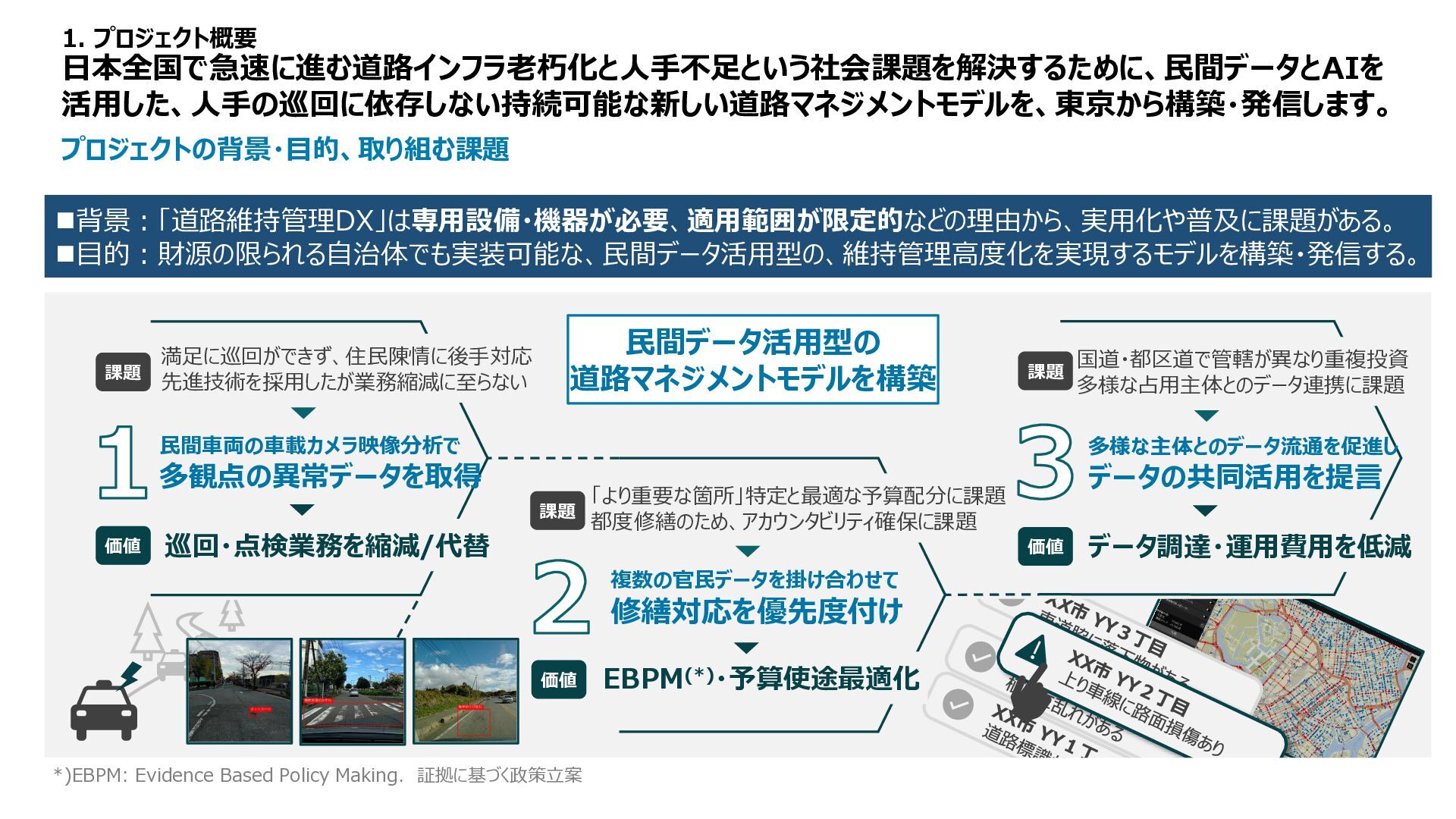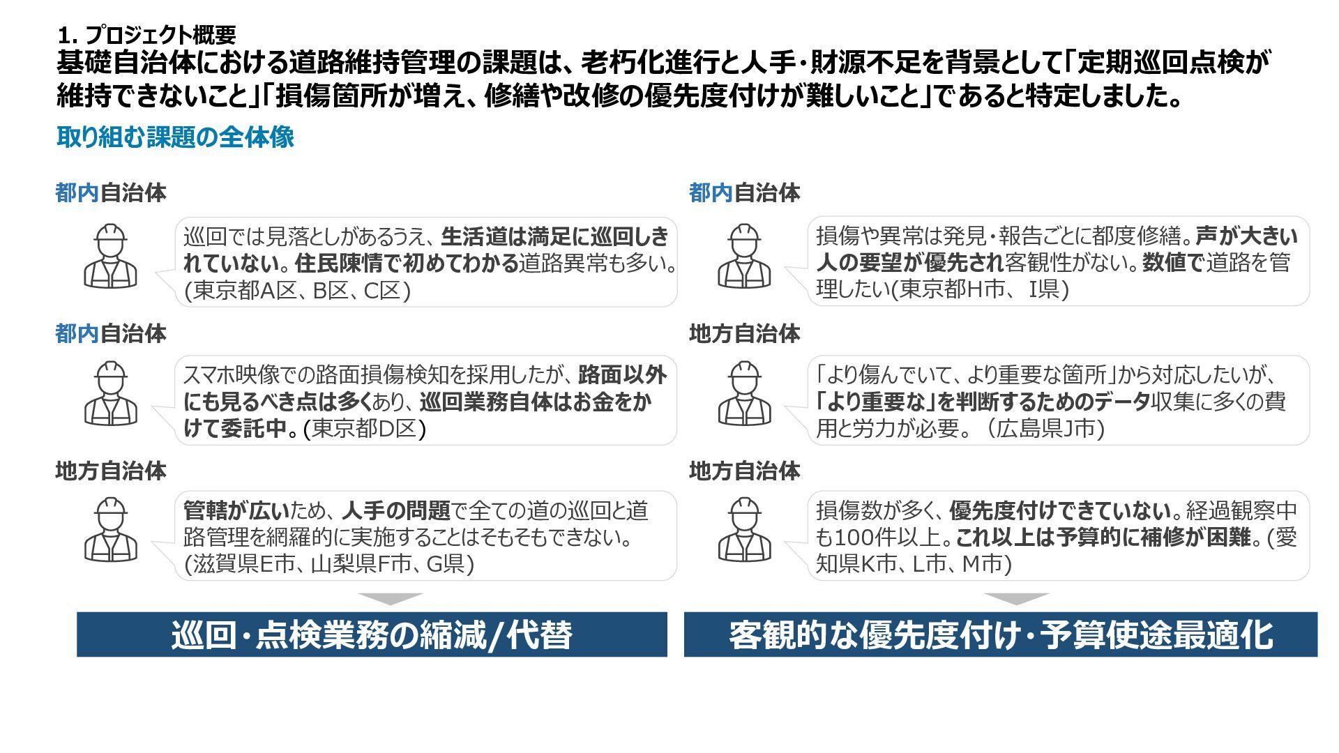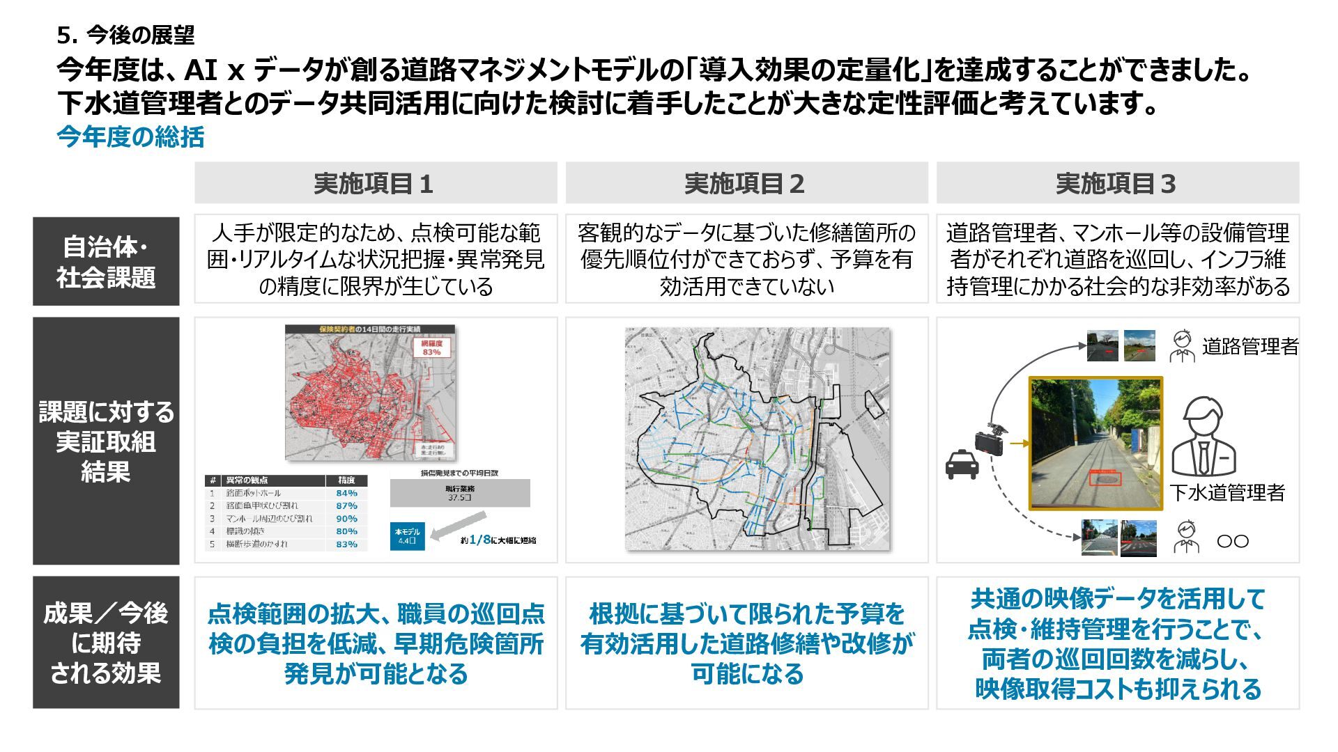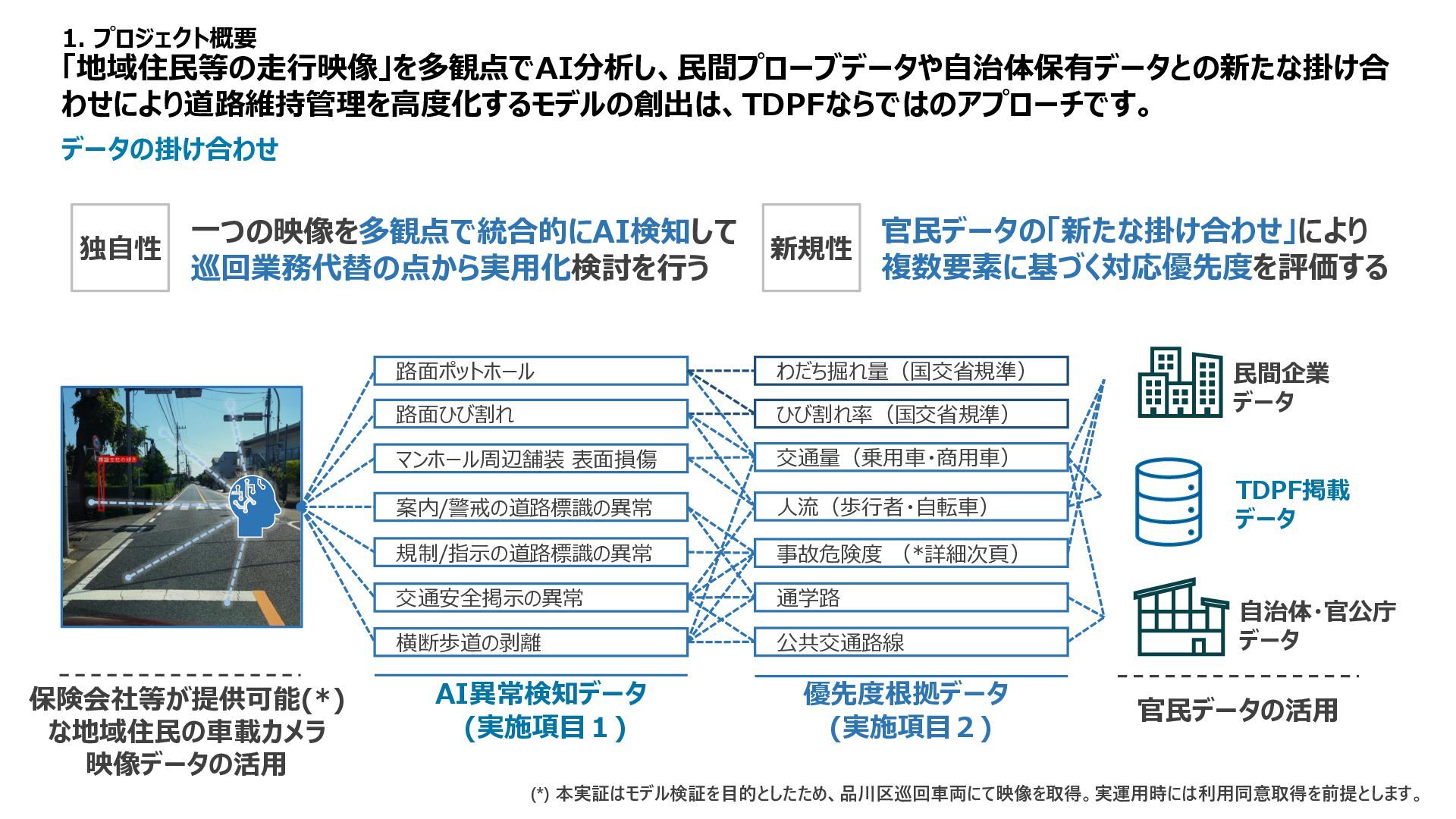 1 2 3 4 5 備考 路面性状調査結果 MCI5以上、 算出不可 ー 3以上5未満 ー 3未満 未計測区間も評価は1点 緊急輸送道路 ー 非該当 ー ー 該当 都市計画道路 ー 非該当 ー 該当 ー バス路線 ー 非該当 ー 該当 ー コミュニティバス路線 ー 非該当 ー 該当 ー 車両通行量 0-500、 算出不可 500-1000 1000-2000 2000-5000 5000以上 台/日、未計測区間も評価は1点 大型車両通行量 0-10、 算出不可 10-20 20-50 50-100 100以上 台/日、未計測区間も評価は1点 Manesus路面異状 0件 ー 1-4件 ー 5件以上 ポットホール、ひび割れ、陥没を抽出 ←優先度・危険度→ 車道 維持 管理 低い 高い No 点数 項目 1 2 3 4 5 備考 通学路 ー 非該当 ー 該当 ー 歩行者通行量 0-500、 算出不可 500-1000 1000-2000 2000-5000 5000以上 人/日、未計測区間も評価は1点 Manesus歩道関連 0件 ー 1-4件 ー 5件以上 相談に歩道が含まれる項目 ←優先度・危険度→ 歩道 低い 高い No 点数 項目 1 2 3 4 5 備考 AI事故リスク(路線) 0-20、 算出不可 20-40 40-60 60-80 80-100 未計測区間も評価は1点 AI事故リスク(交差点) 0-20、 算出不可 20-40 40-60 60-80 80-100 未計測区間も評価は1点 Manesus事故リスク関連 0件 ー 1-4件 ー 5件以上 カーブミラー、ガードパイプ、ポストコーンを抽出 事故による損傷報告が多い施設 ←優先度・危険度→ 安全 交通・ 事故 建設コンサルタントの知見に基づき優先度付け方案の策定 「事故リスク」「交通量」「歩行者数」等のデータを適用 TDPF掲載データ 自治体・官公庁データ 民間企業データ 車道観点での優先度図 歩道観点での優先度図 安全交通観点での優先度図