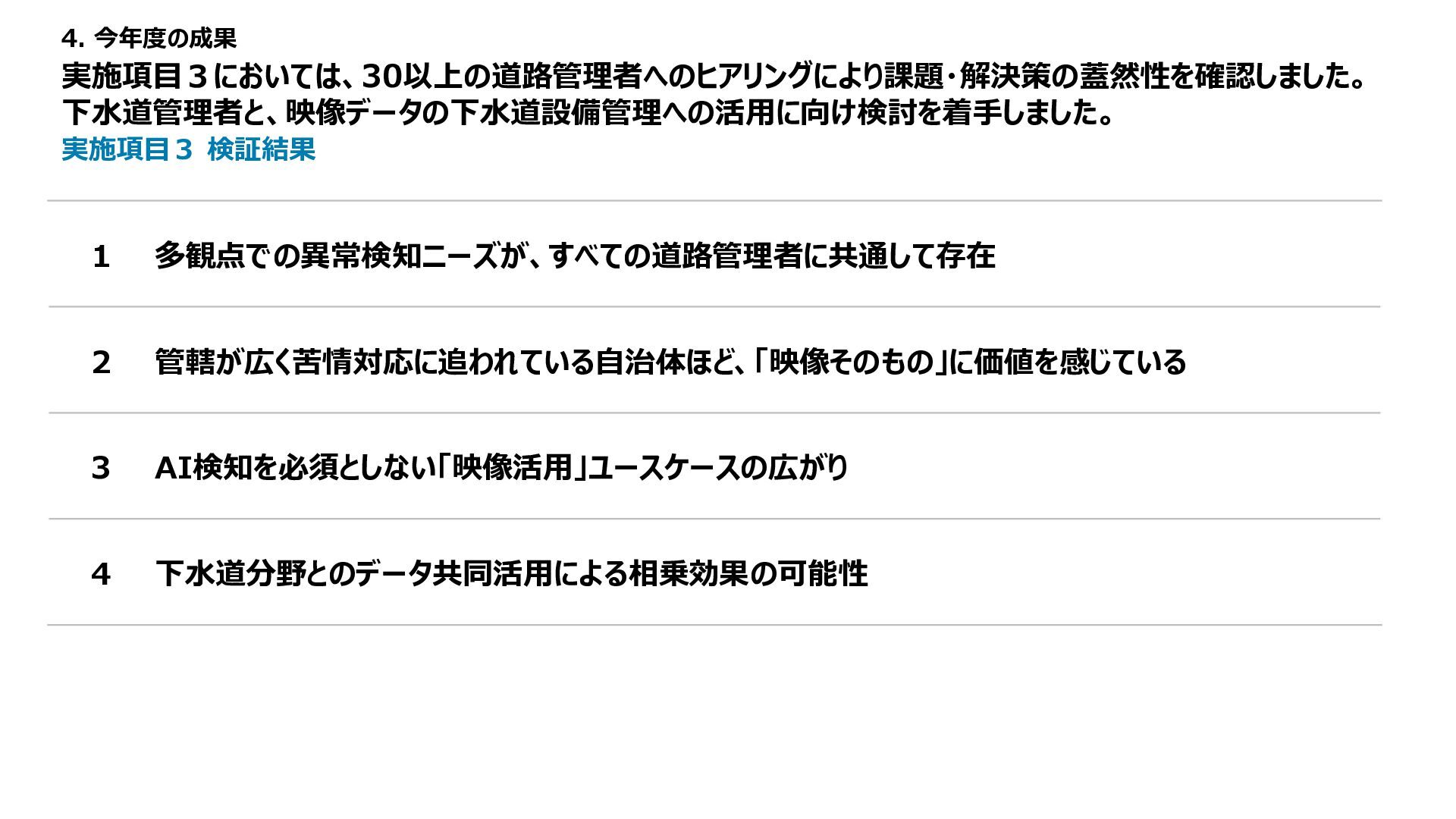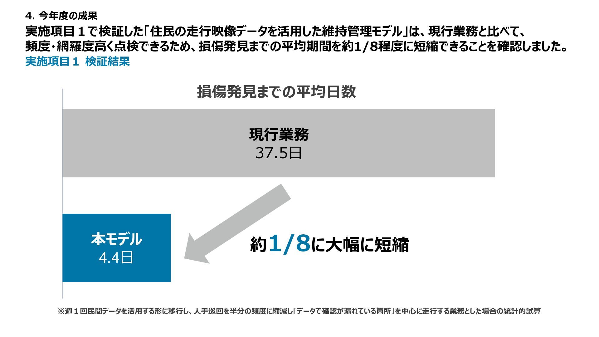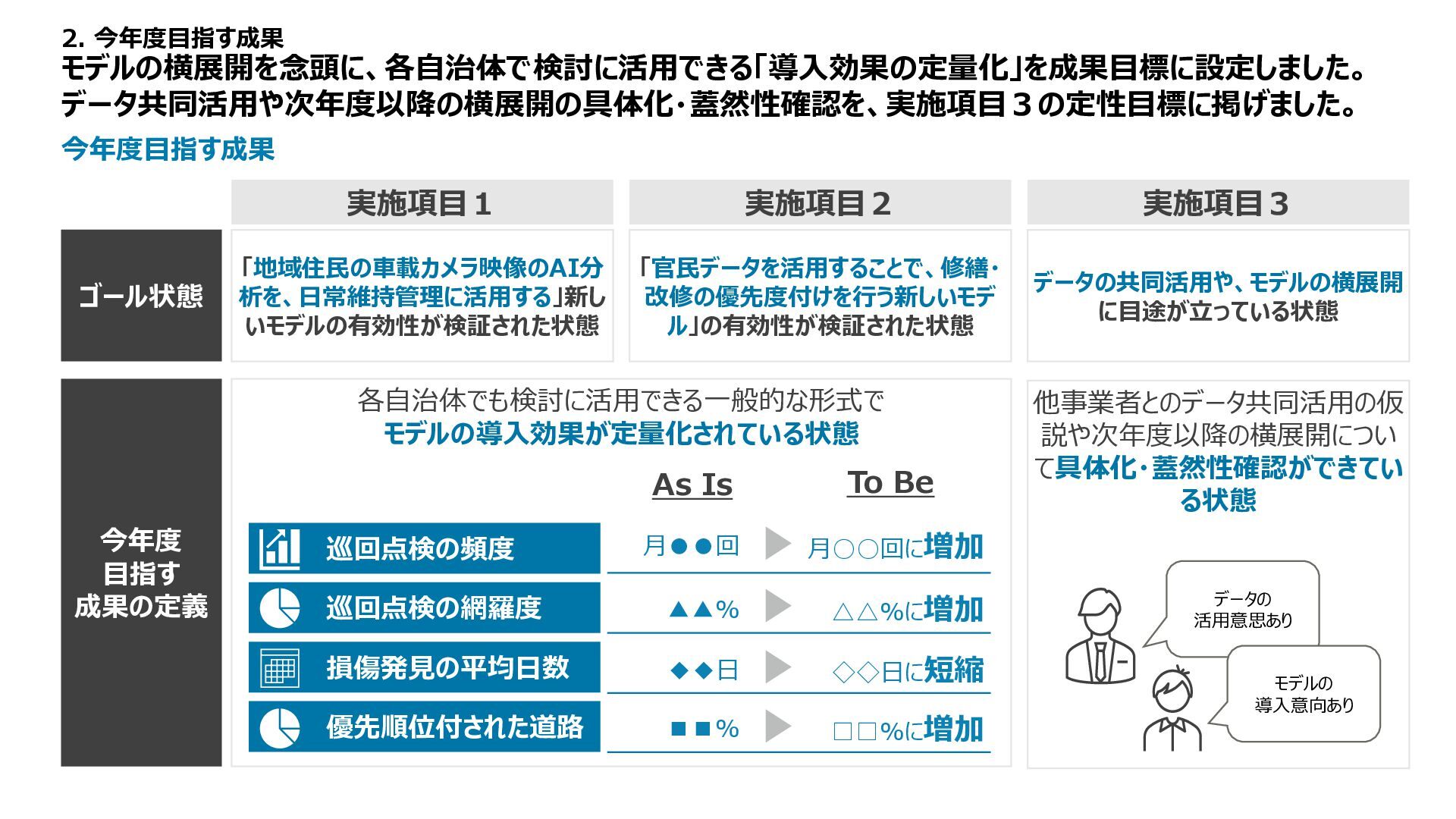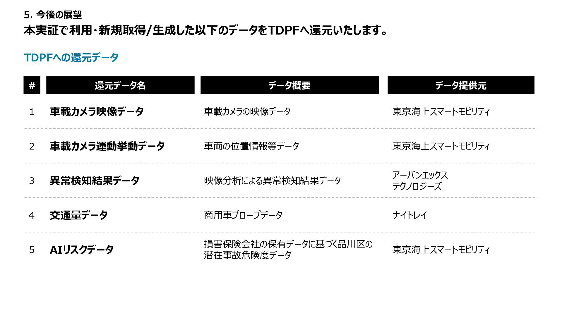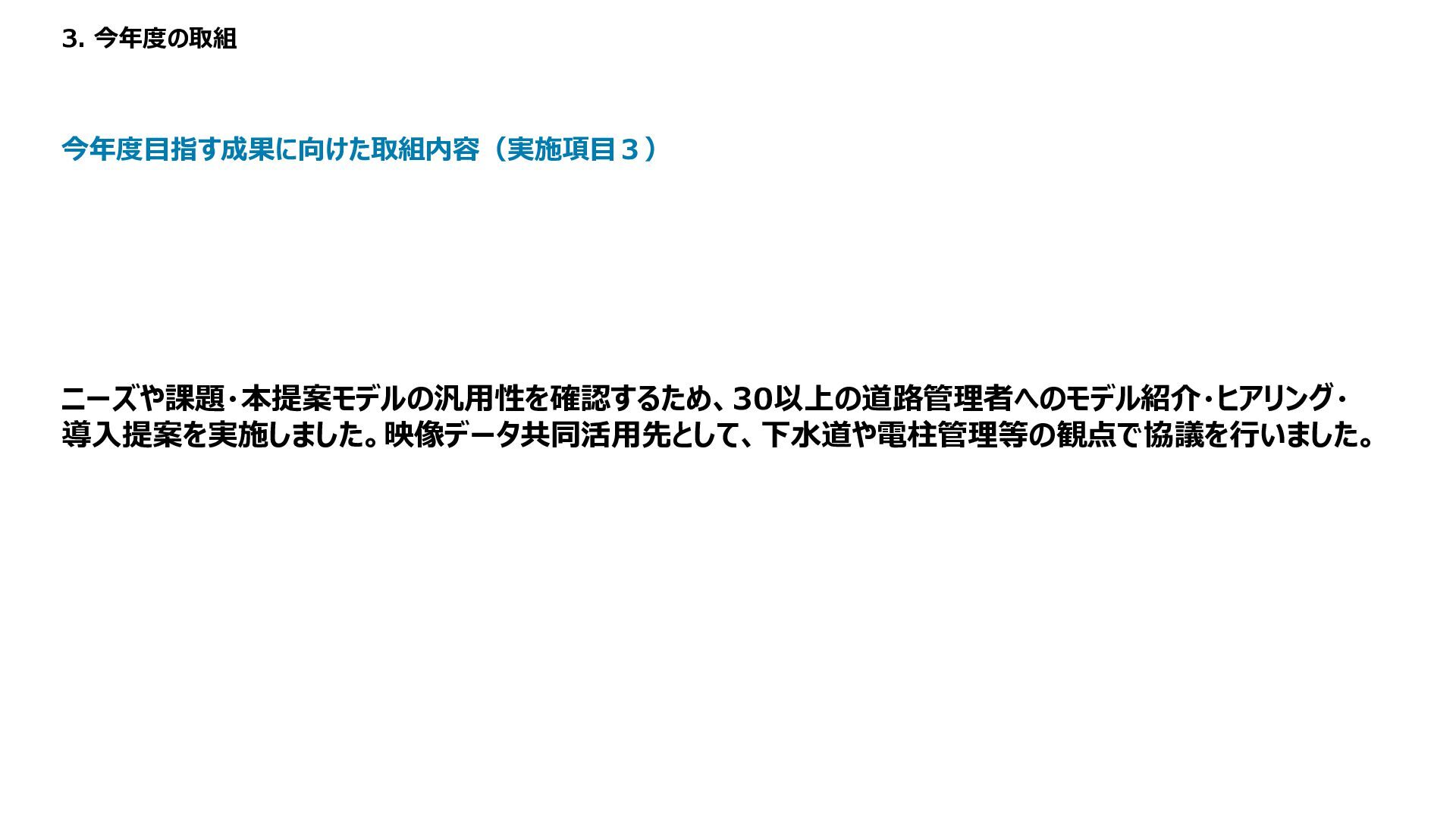 1 2 3 4 5 備考 路面性状調査結果 MCI5以上、 算出不可 ー 3以上5未満 ー 3未満 未計測区間も評価は1点 緊急輸送道路 ー 非該当 ー ー 該当 都市計画道路 ー 非該当 ー 該当 ー バス路線 ー 非該当 ー 該当 ー コミュニティバス路線 ー 非該当 ー 該当 ー 車両通行量 0-500、 算出不可 500-1000 1000-2000 2000-5000 5000以上 台/日、未計測区間も評価は1点 大型車両通行量 0-10、 算出不可 10-20 20-50 50-100 100以上 台/日、未計測区間も評価は1点 Manesus路面異状 0件 ー 1-4件 ー 5件以上 ポットホール、ひび割れ、陥没を抽出 ←優先度・危険度→ 車道 維持 管理 低い 高い No 点数 項目 1 2 3 4 5 備考 通学路 ー 非該当 ー 該当 ー 歩行者通行量 0-500、 算出不可 500-1000 1000-2000 2000-5000 5000以上 人/日、未計測区間も評価は1点 Manesus歩道関連 0件 ー 1-4件 ー 5件以上 相談に歩道が含まれる項目 ←優先度・危険度→ 歩道 低い 高い No 点数 項目 1 2 3 4 5 備考 AI事故リスク(路線) 0-20、 算出不可 20-40 40-60 60-80 80-100 未計測区間も評価は1点 AI事故リスク(交差点) 0-20、 算出不可 20-40 40-60 60-80 80-100 未計測区間も評価は1点 Manesus事故リスク関連 0件 ー 1-4件 ー 5件以上 カーブミラー、ガードパイプ、ポストコーンを抽出 事故による損傷報告が多い施設 ←優先度・危険度→ 安全 交通・ 事故 建設コンサルタントの知見に基づき優先度付け方案の策定 「事故リスク」「交通量」「歩行者数」等のデータを適用 TDPF掲載データ 自治体・官公庁データ 民間企業データ 車道観点での優先度図 歩道観点での優先度図 安全交通観点での優先度図