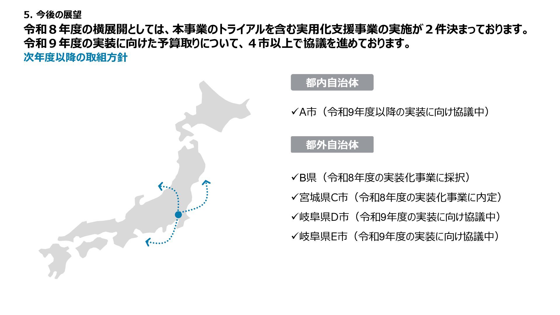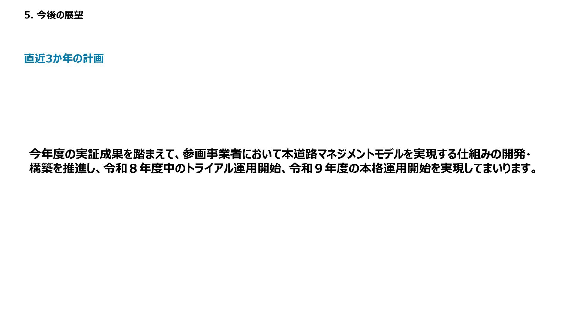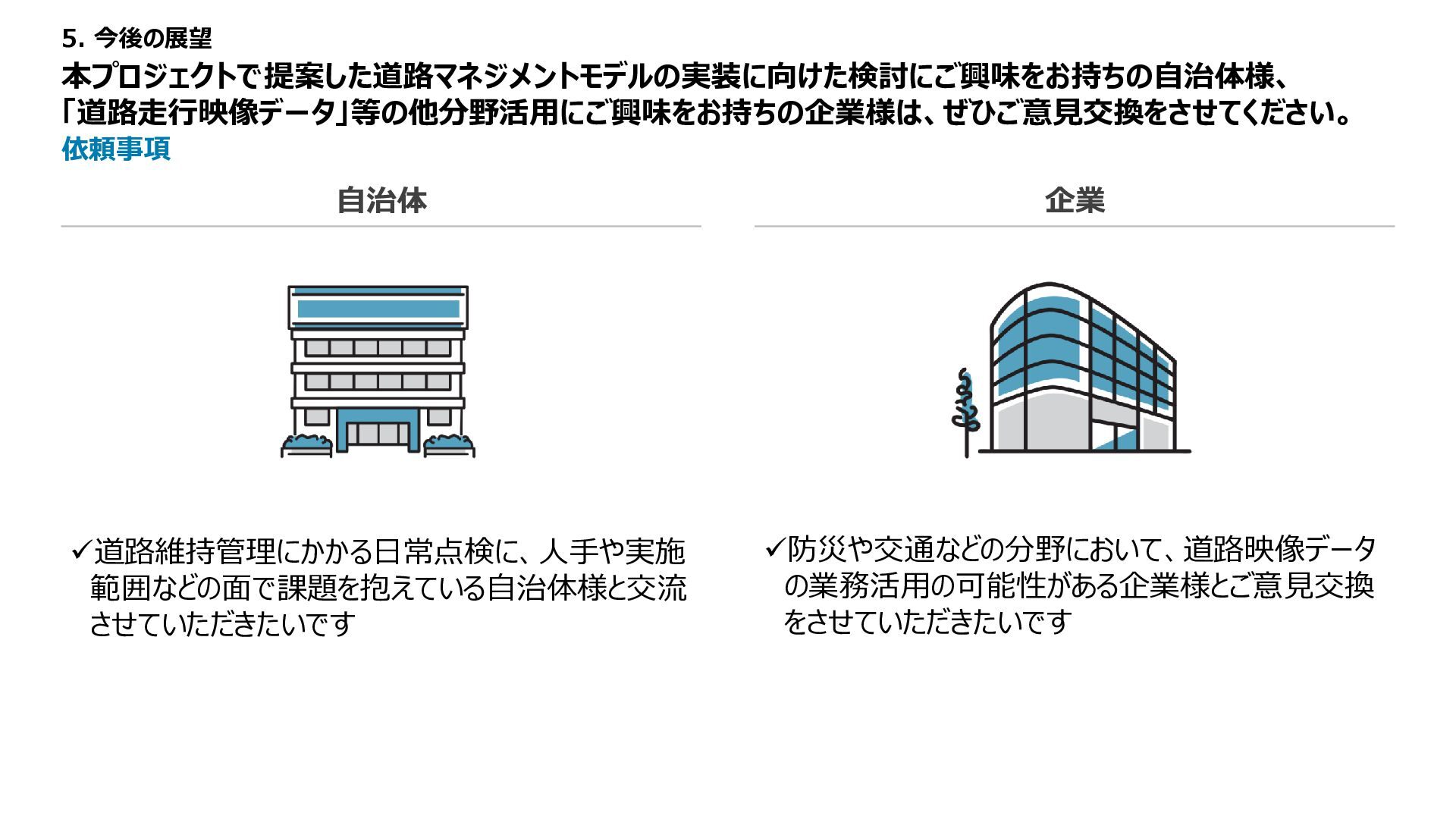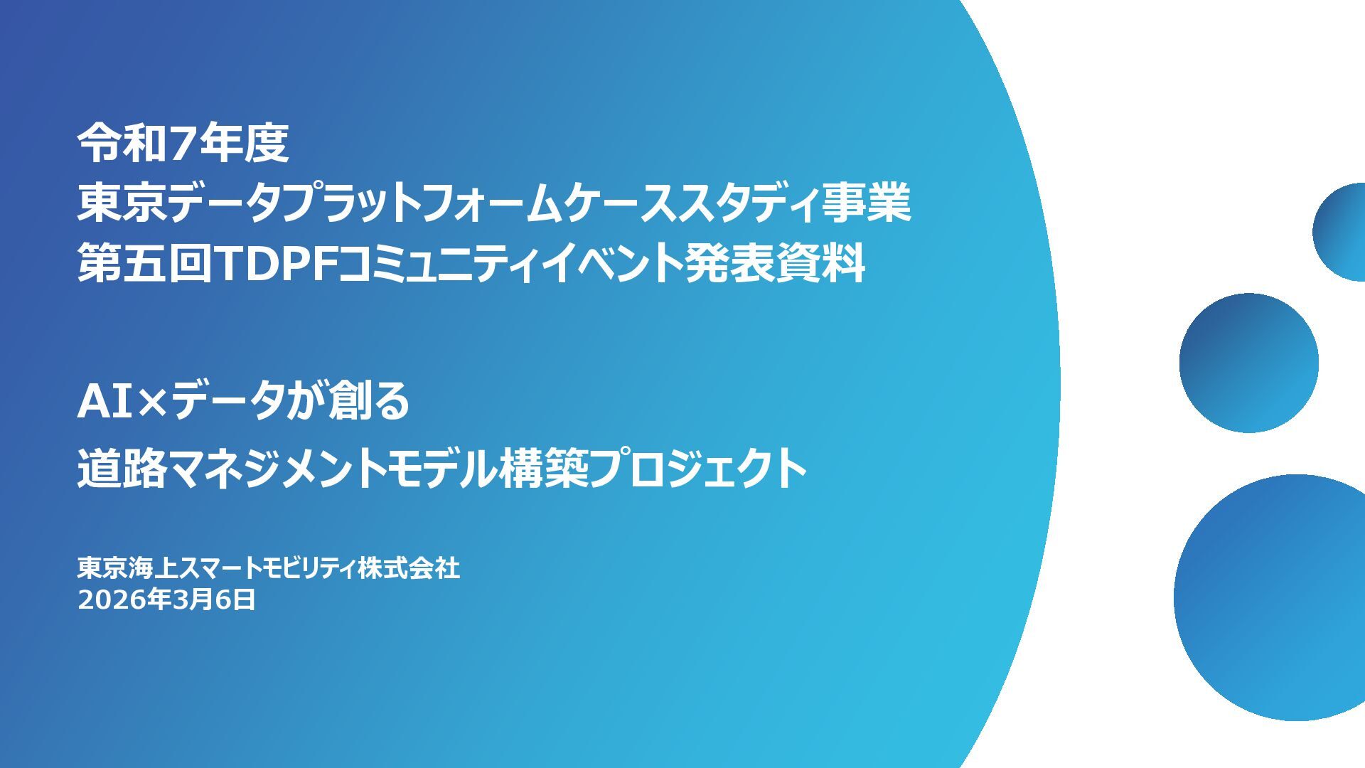 1 2 3 4 5 備考 路面性状調査結果 MCI5以上、 算出不可 ー 3以上5未満 ー 3未満 未計測区間も評価は1点 緊急輸送道路 ー 非該当 ー ー 該当 都市計画道路 ー 非該当 ー 該当 ー バス路線 ー 非該当 ー 該当 ー コミュニティバス路線 ー 非該当 ー 該当 ー 車両通行量 0-500、 算出不可 500-1000 1000-2000 2000-5000 5000以上 台/日、未計測区間も評価は1点 大型車両通行量 0-10、 算出不可 10-20 20-50 50-100 100以上 台/日、未計測区間も評価は1点 Manesus路面異状 0件 ー 1-4件 ー 5件以上 ポットホール、ひび割れ、陥没を抽出 ←優先度・危険度→ 車道 維持 管理 低い 高い No 点数 項目 1 2 3 4 5 備考 通学路 ー 非該当 ー 該当 ー 歩行者通行量 0-500、 算出不可 500-1000 1000-2000 2000-5000 5000以上 人/日、未計測区間も評価は1点 Manesus歩道関連 0件 ー 1-4件 ー 5件以上 相談に歩道が含まれる項目 ←優先度・危険度→ 歩道 低い 高い No 点数 項目 1 2 3 4 5 備考 AI事故リスク(路線) 0-20、 算出不可 20-40 40-60 60-80 80-100 未計測区間も評価は1点 AI事故リスク(交差点) 0-20、 算出不可 20-40 40-60 60-80 80-100 未計測区間も評価は1点 Manesus事故リスク関連 0件 ー 1-4件 ー 5件以上 カーブミラー、ガードパイプ、ポストコーンを抽出 事故による損傷報告が多い施設 ←優先度・危険度→ 安全 交通・ 事故 建設コンサルタントの知見に基づき優先度付け方案の策定 「事故リスク」「交通量」「歩行者数」等のデータを適用 TDPF掲載データ 自治体・官公庁データ 民間企業データ 車道観点での優先度図 歩道観点での優先度図 安全交通観点での優先度図