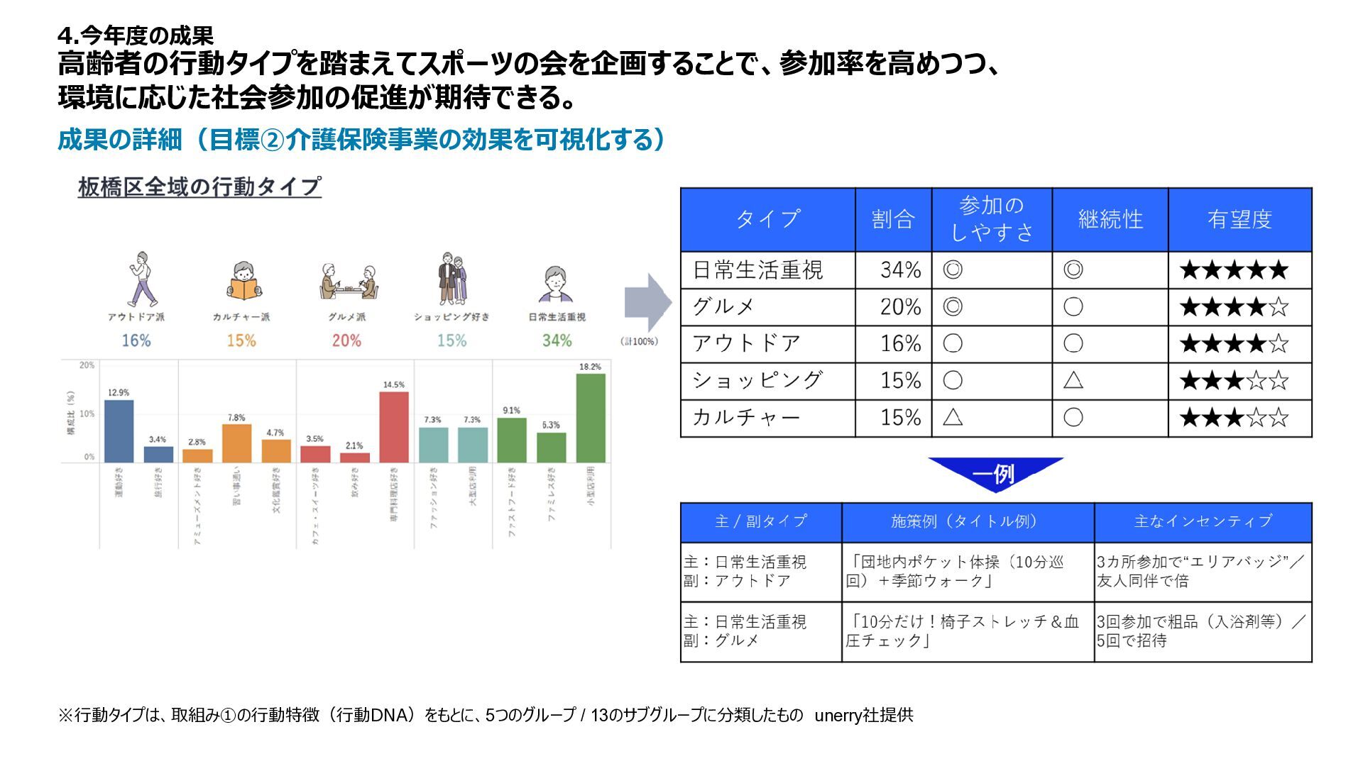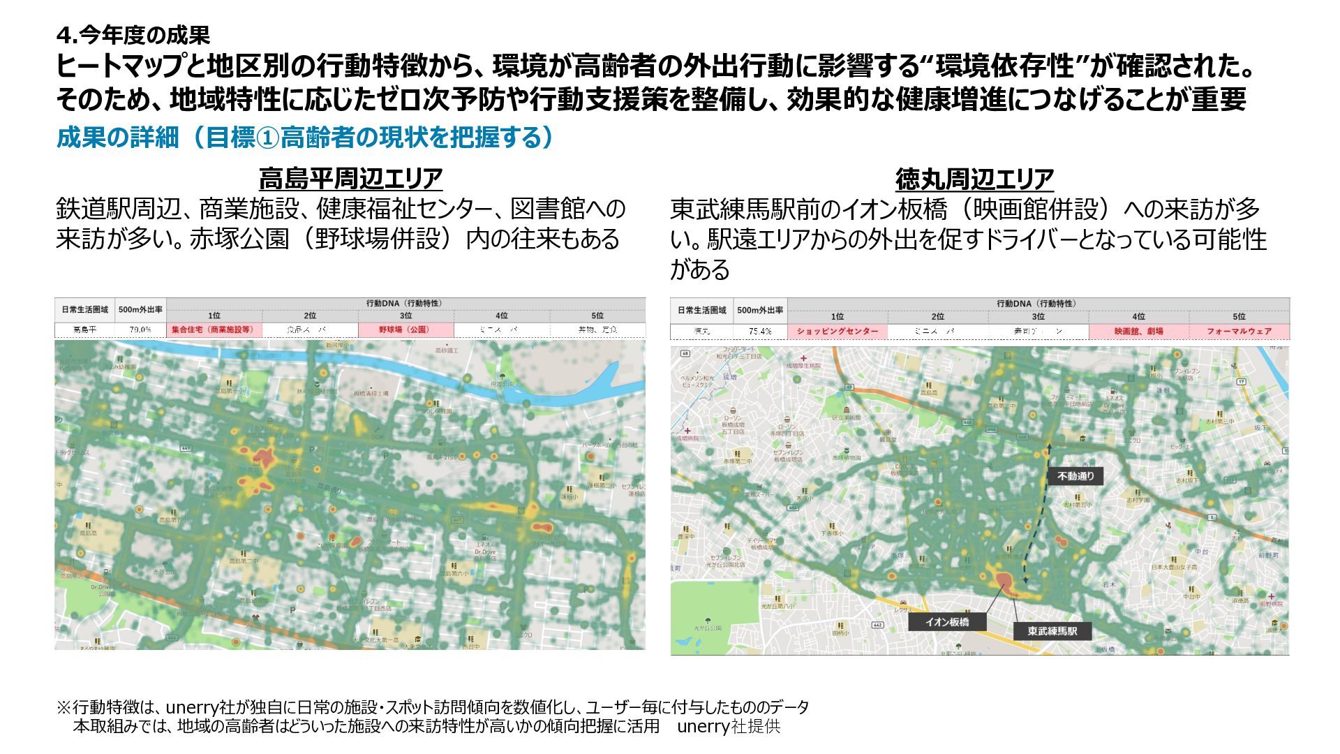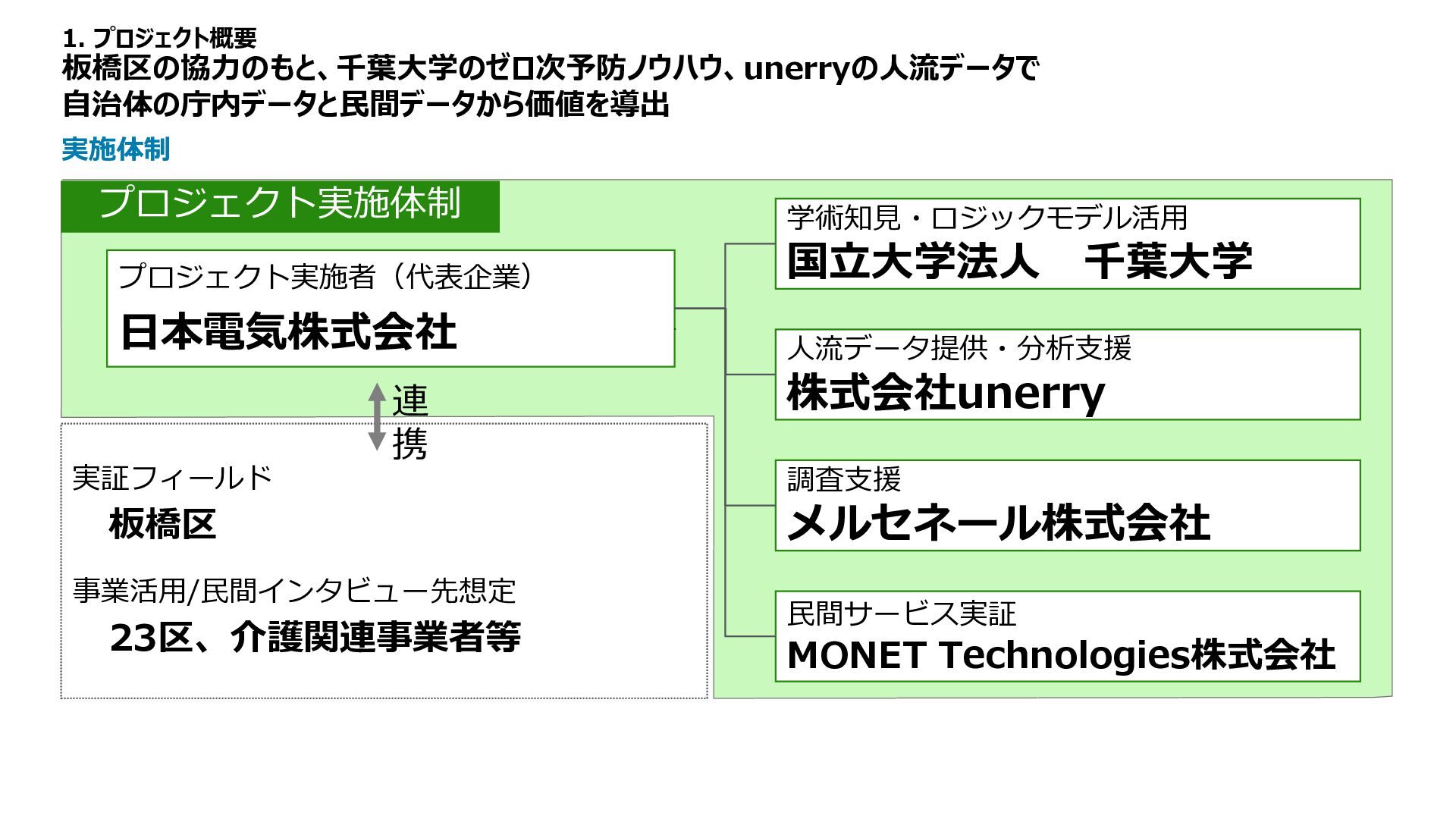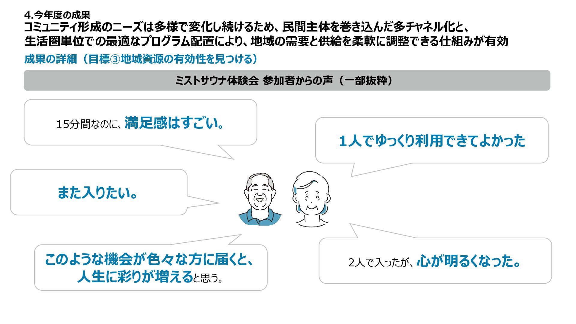 :約40分/人 利用上限数 :8人/日 料金 :無料 成果の詳細(目標③地域資源の有効性を見つける) 住民のコミュニティ形成を目的としたミストサウナ体験会を開催。2025年12月6日〜10日の5日間で 24名が参加し、団地内の安心できる環境で“温熱体験×交流”の機会を提供した。 4.今年度の成果 内容 目的 団地の特性を活かした、安心コミュニティで、 潜在ニーズを把握し施策検討につなげる 企画体制 板橋区 まちづくり推進室、UR、 MONET Technologies、NEC 企画の特徴 イベント的運営形態を採用し、 モビリティ活用による地域のにぎわいを創出 データ活用 実施後のアンケートにより地域住民の率直な声を把握し、 今後の地域づくり・団地運営・施策検討に活用 運行実績 体験を通じてリラックスや健康への気づきに加え、自然な会話が生まれ、“体験起点のコミュニティ”の可能性 を確認。UR団地内の空間資源を活かした、小規模で実施しやすい新たなコミュニティ形成手法として有効性 を示せた。