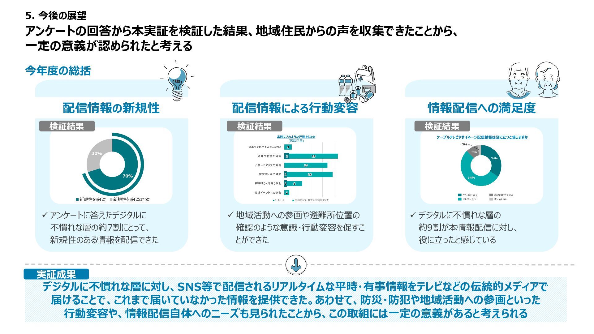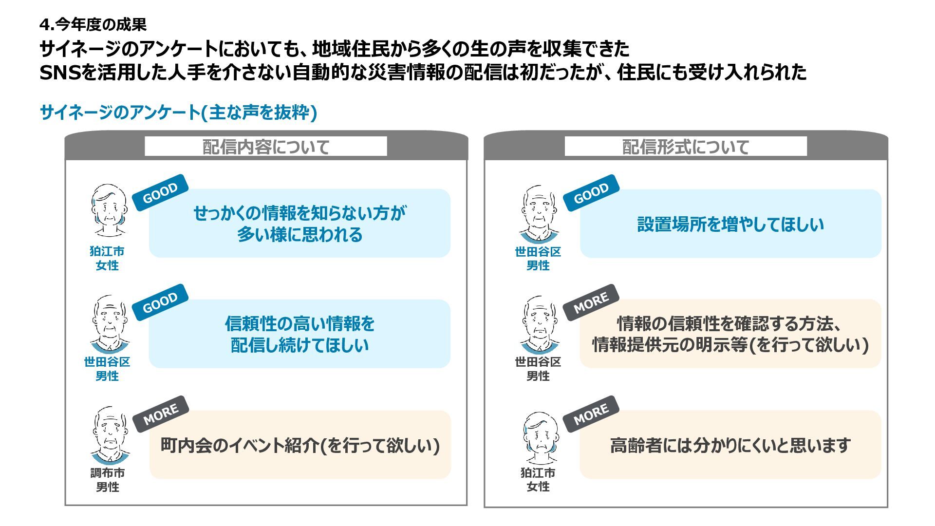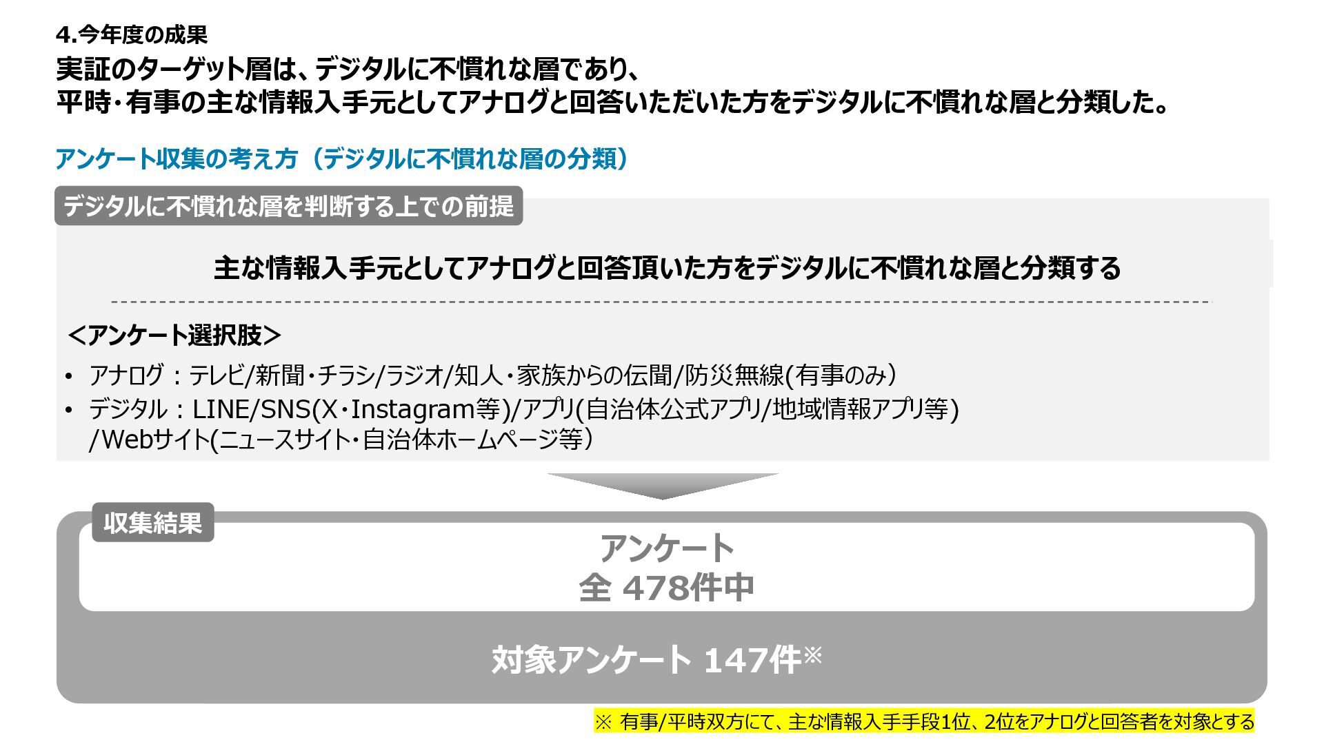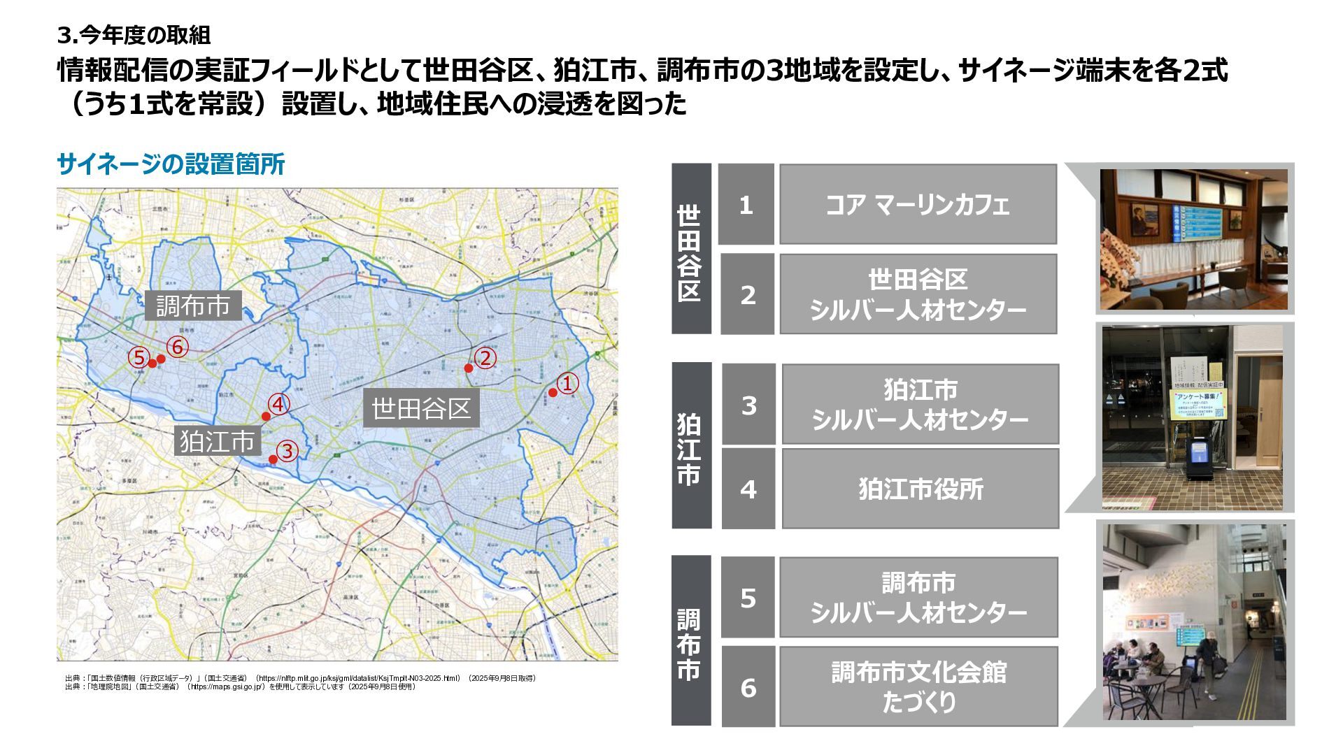 有事情報 ⚫メディアで紹介されることが多い地域や、 人流のあると考えられる地域の特定 還元内容 平時情報 ⚫中高齢層の抱えている課題やニーズ推測 ⚫中高齢層に不足している情報の推測 ⚫中高齢層の行動変容促進サービスの参考 ⚫ニーズ有無の推測 分類 地域 期間 2025/11/1 ~ 2026/2/14 内容 交通事故や浸水などの 発災情報 (JX通信社提供) 地上波テレビで紹介さ れた地域情報 (エム・データ社提供) 実証実験を 通じて 入手した 地域住民の アンケート ローデータ 分析結果 各設問への回答 実証実験への自由 回答によるフィードバック アンケートの集計結果 [新規性] [行動変容][有効性] 世田谷区 狛江市 調布市 凡例