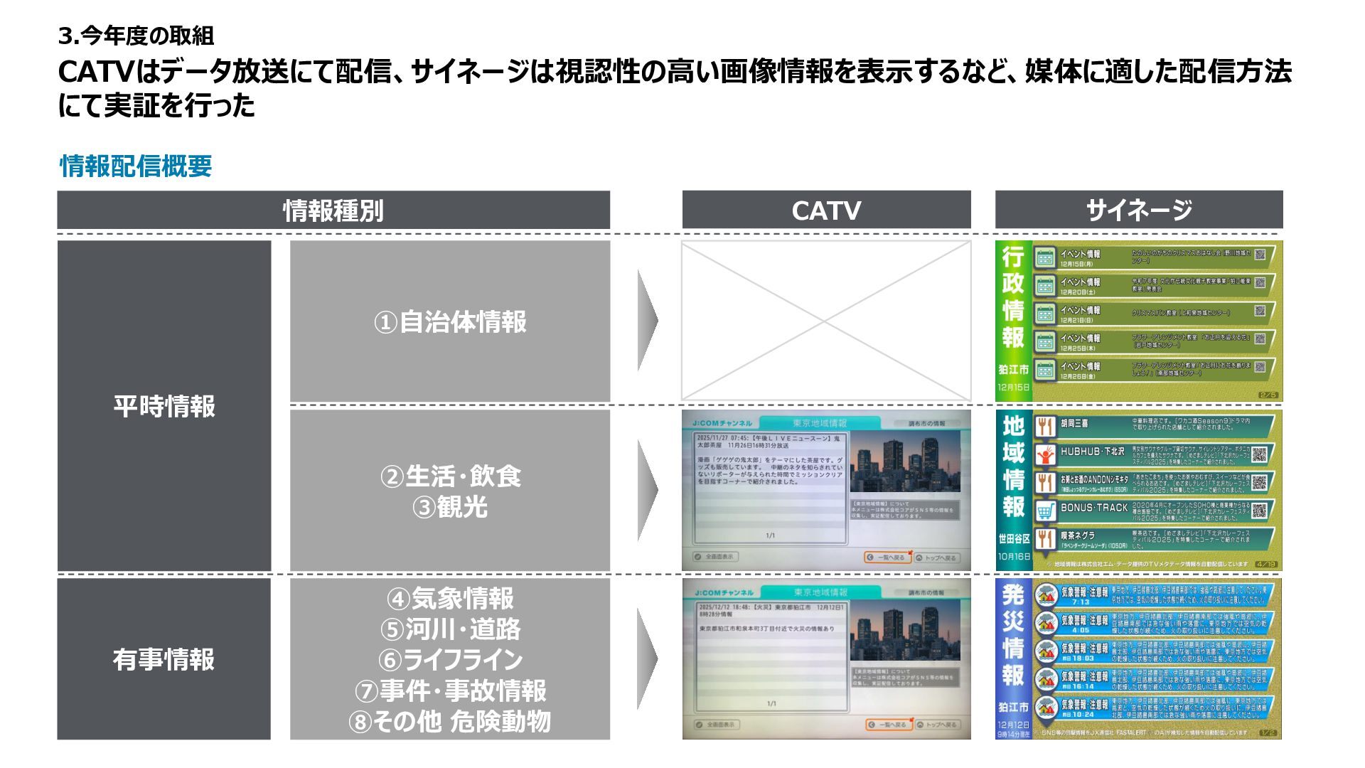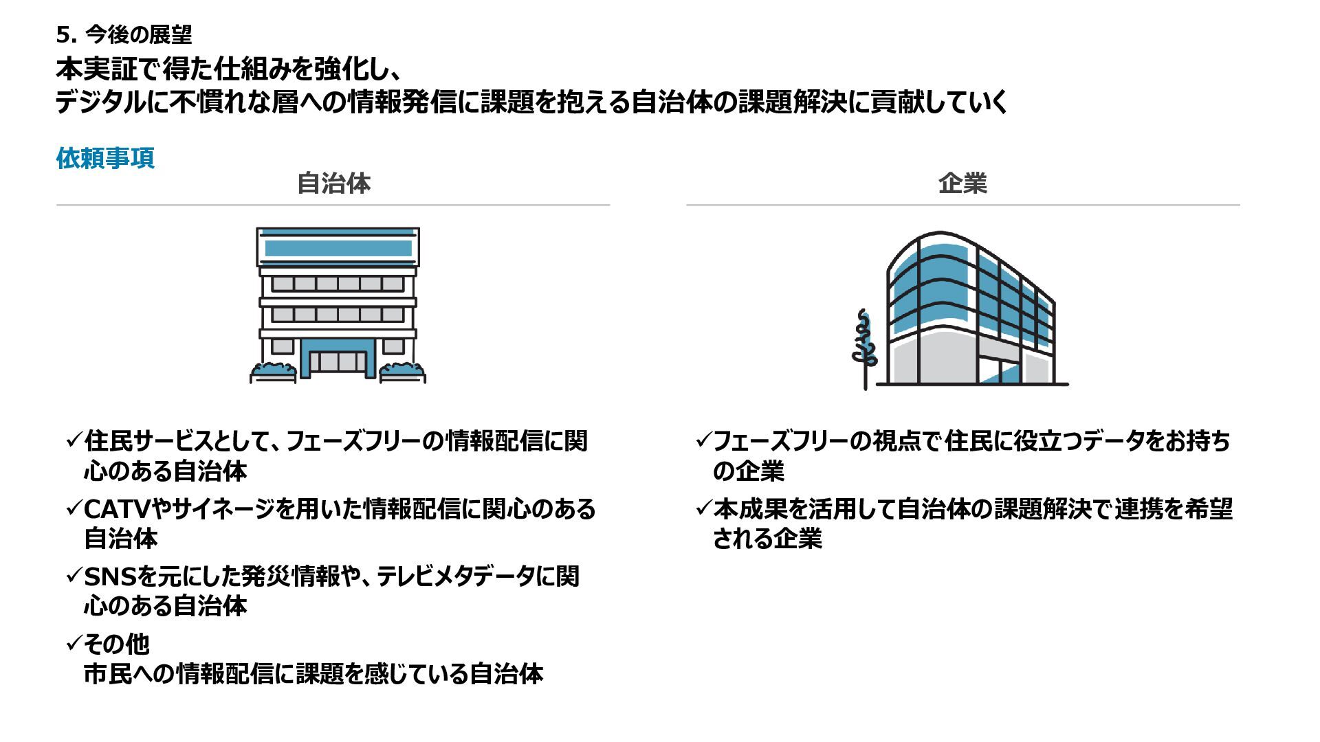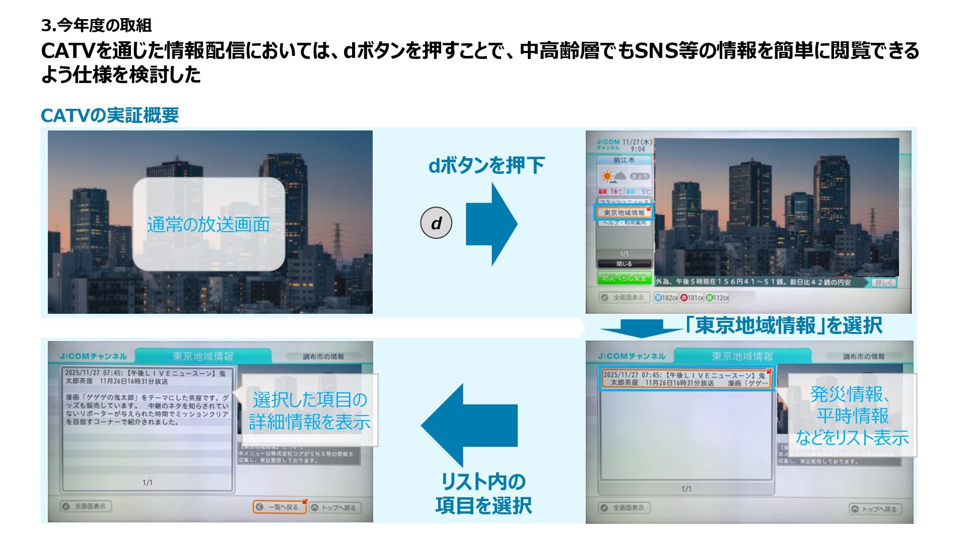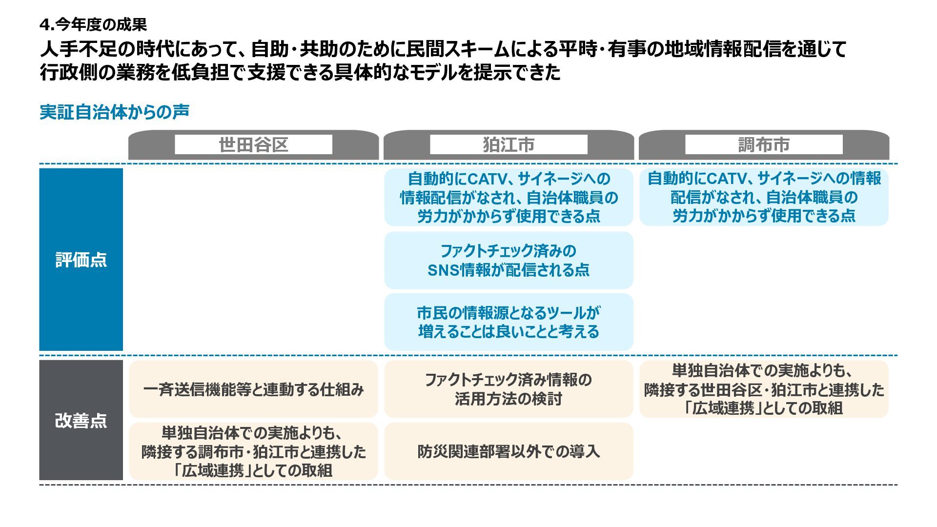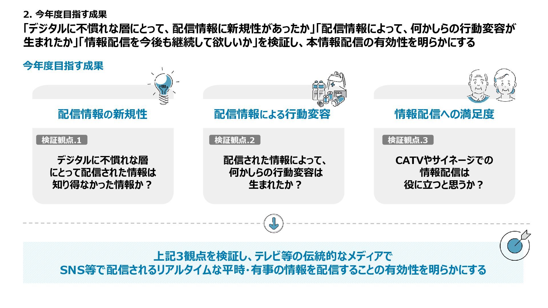 有事情報 ⚫メディアで紹介されることが多い地域や、 人流のあると考えられる地域の特定 還元内容 平時情報 ⚫中高齢層の抱えている課題やニーズ推測 ⚫中高齢層に不足している情報の推測 ⚫中高齢層の行動変容促進サービスの参考 ⚫ニーズ有無の推測 分類 地域 期間 2025/11/1 ~ 2026/2/14 内容 交通事故や浸水などの 発災情報 (JX通信社提供) 地上波テレビで紹介さ れた地域情報 (エム・データ社提供) 実証実験を 通じて 入手した 地域住民の アンケート ローデータ 分析結果 各設問への回答 実証実験への自由 回答によるフィードバック アンケートの集計結果 [新規性] [行動変容][有効性] 世田谷区 狛江市 調布市 凡例
