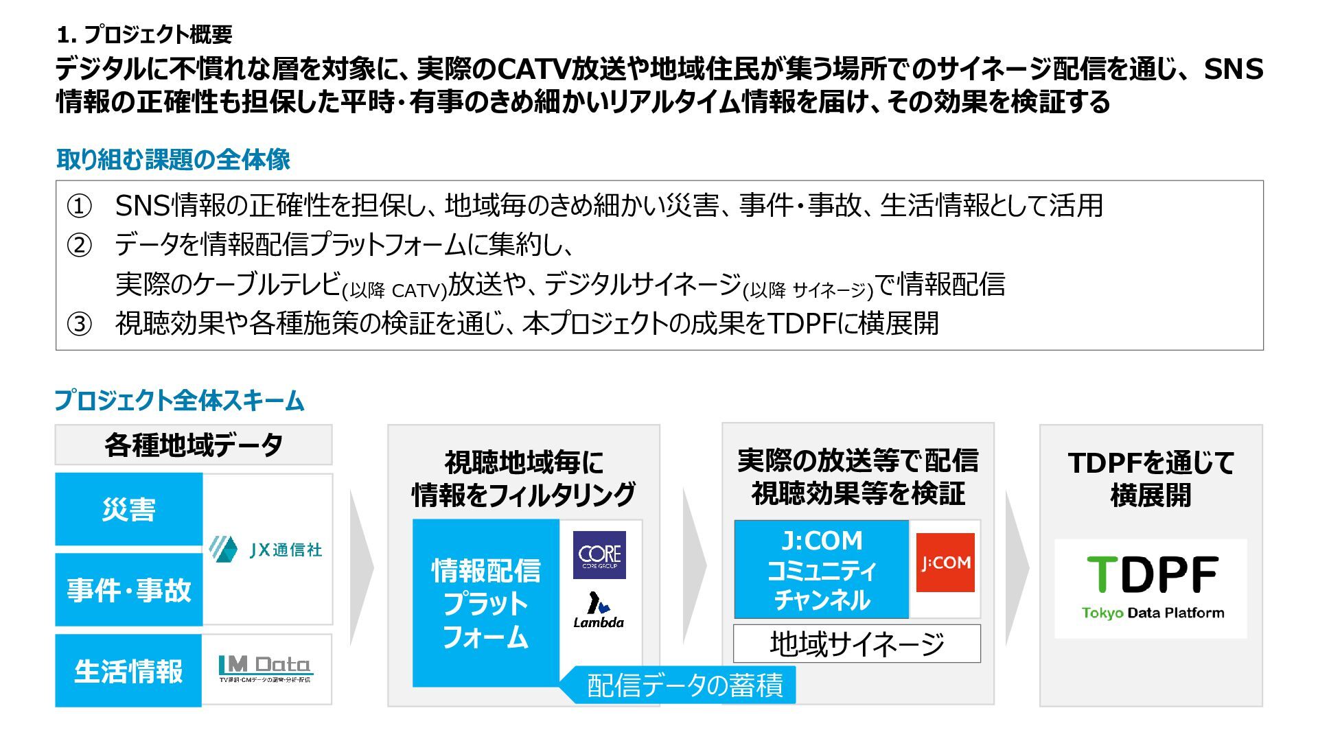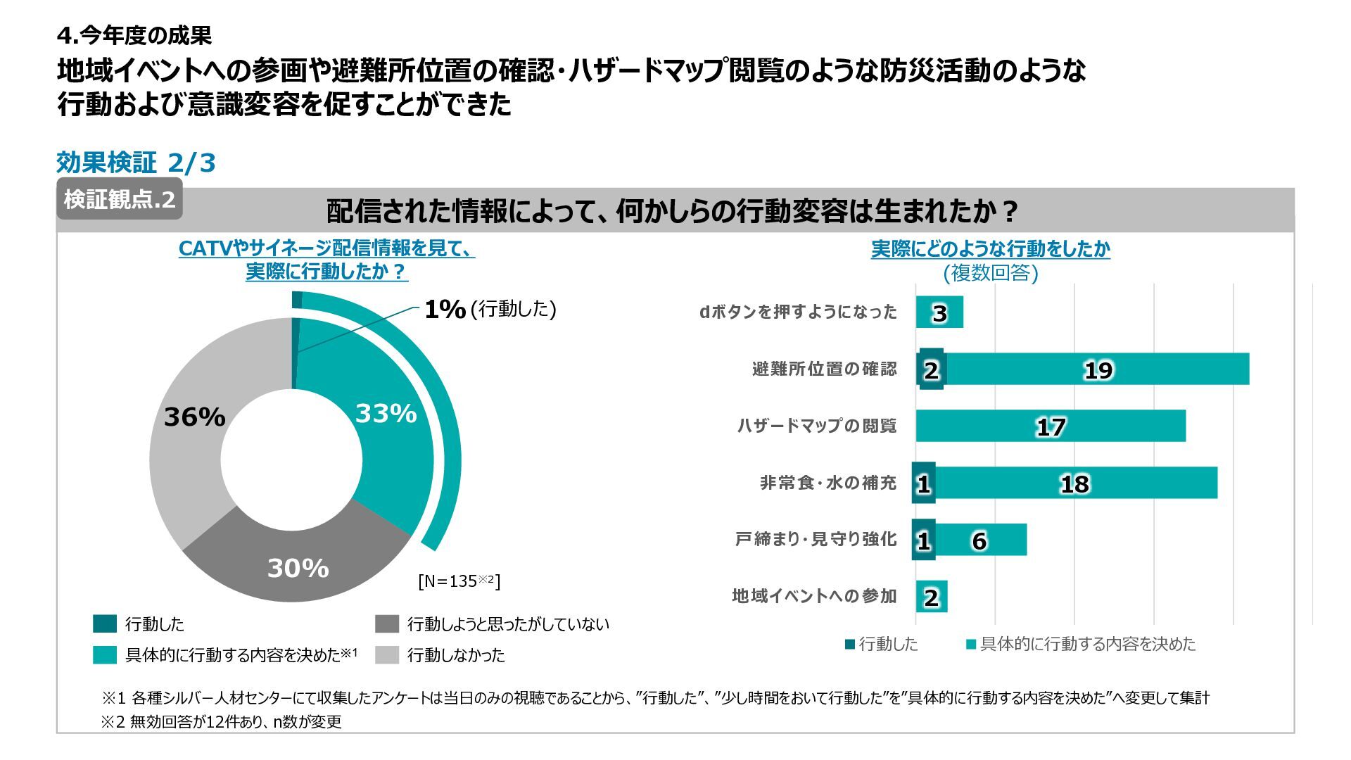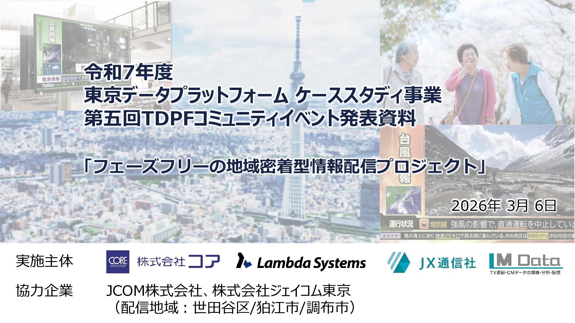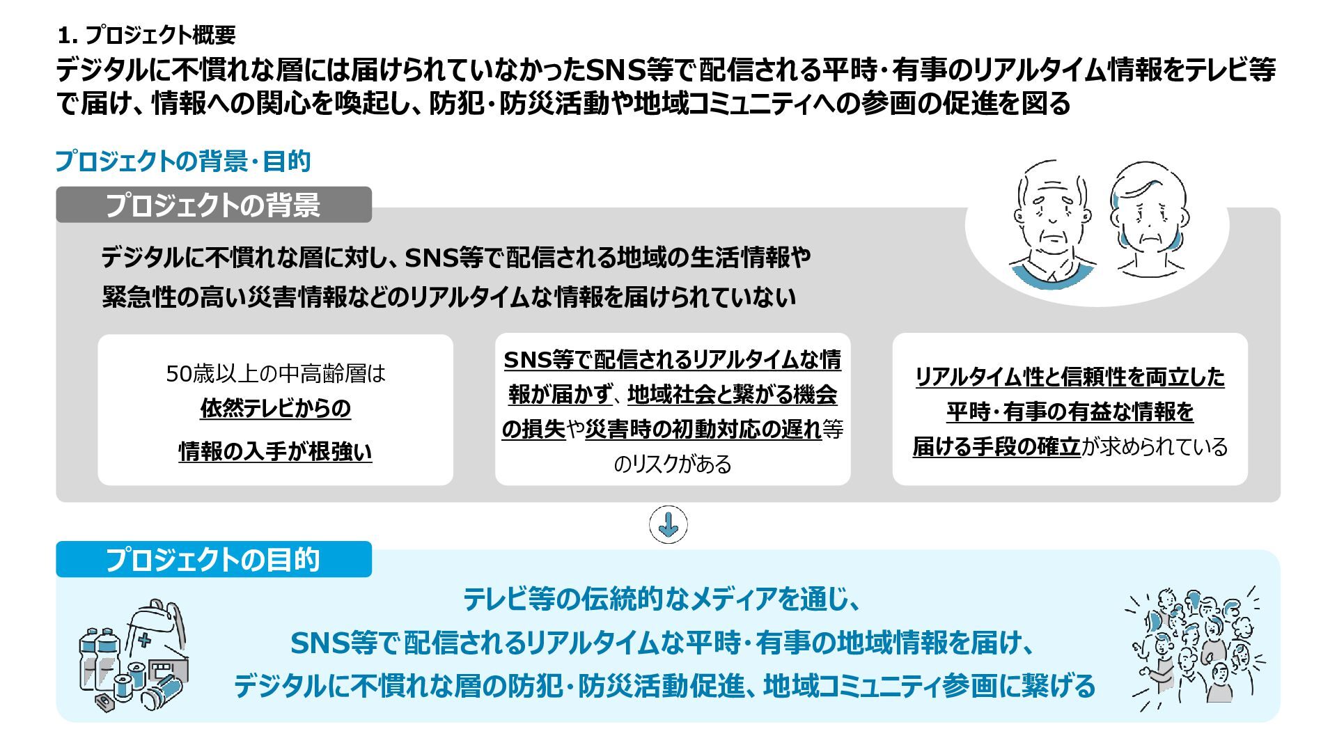 有事情報 ⚫メディアで紹介されることが多い地域や、 人流のあると考えられる地域の特定 還元内容 平時情報 ⚫中高齢層の抱えている課題やニーズ推測 ⚫中高齢層に不足している情報の推測 ⚫中高齢層の行動変容促進サービスの参考 ⚫ニーズ有無の推測 分類 地域 期間 2025/11/1 ~ 2026/2/14 内容 交通事故や浸水などの 発災情報 (JX通信社提供) 地上波テレビで紹介さ れた地域情報 (エム・データ社提供) 実証実験を 通じて 入手した 地域住民の アンケート ローデータ 分析結果 各設問への回答 実証実験への自由 回答によるフィードバック アンケートの集計結果 [新規性] [行動変容][有効性] 世田谷区 狛江市 調布市 凡例