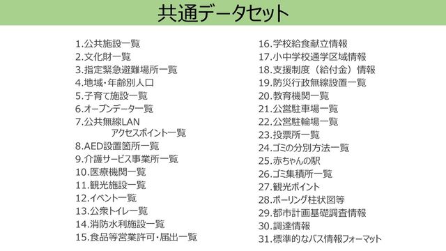 10.医療機関一覧 11.観光施設一覧 12.イベント一覧 13.公衆トイレ一覧 14.消防水利施設一覧 15.食品等営業許可・届出一覧 16.学校給食献立情報 17.小中学校通学区域情報 18.支援制度(給付金)情報 19.防災行政無線設置一覧 20.教育機関一覧 21.公営駐車場一覧 22.公営駐輪場一覧 23.投票所一覧 24.ゴミの分別方法一覧 25.赤ちゃんの駅 26.ゴミ集積所一覧 27.観光ポイント 28.ボーリング柱状図等 29.都市計画基礎調査情報 30.調達情報 31.標準的なバス情報フォーマット 共通データセット