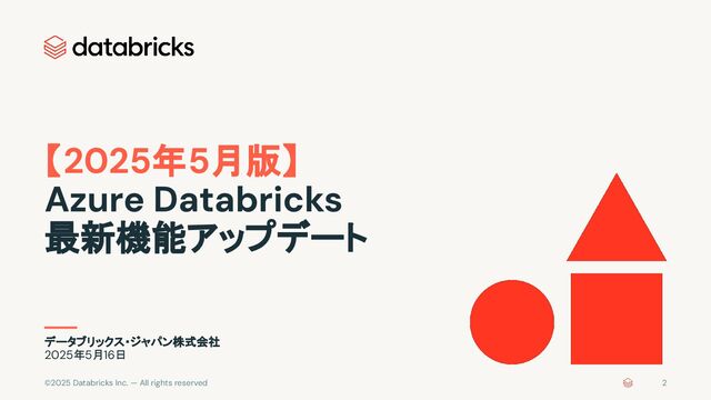 A. 基盤モデル API:Claude 3.7 Sonnet, Llama 4 Maverick B. AI/BI Genie:Genie Conversation API C. Delta Lake:自動リキッドクラスタリング D. レイクハウスフェデレーション:BigQuery, Oracle, Teradata II. 最新機能アップデート: Microsoftクラウド関連 (15分) A. 自動ID管理:Entra IDからユーザー/グループ/SPを自動同期 B. DatabricksジョブのPower BIタスク C. Fabric/Azure Data FactoryのDatabricksジョブアクティビティ アジェンダ (Databricksパート) 1 2