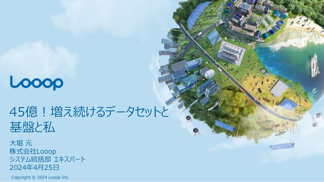 Copyright © 2024 Looop Inc. 45億︕増え続けるデータセットと 基盤と私 ⼤堀 元 株式会社Looop