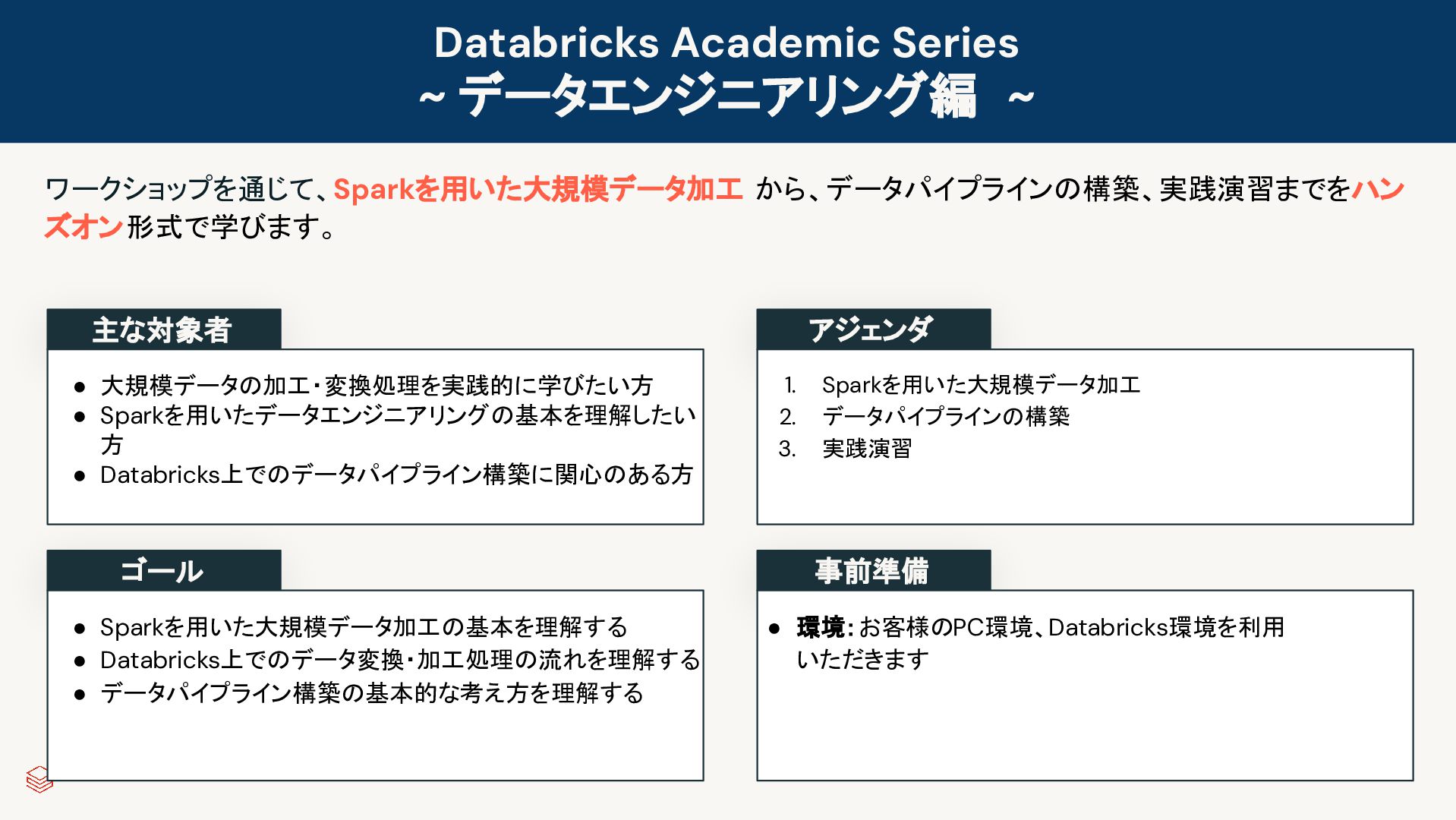 1. Databricks Academic Series ~ データエンジニアリング編 ~ 主な対象者 ワークショップを通じて、Sparkを用いた大規模データ加工 から、データパイプラインの構築、実践演習までをハン ズオン形式で学びます。