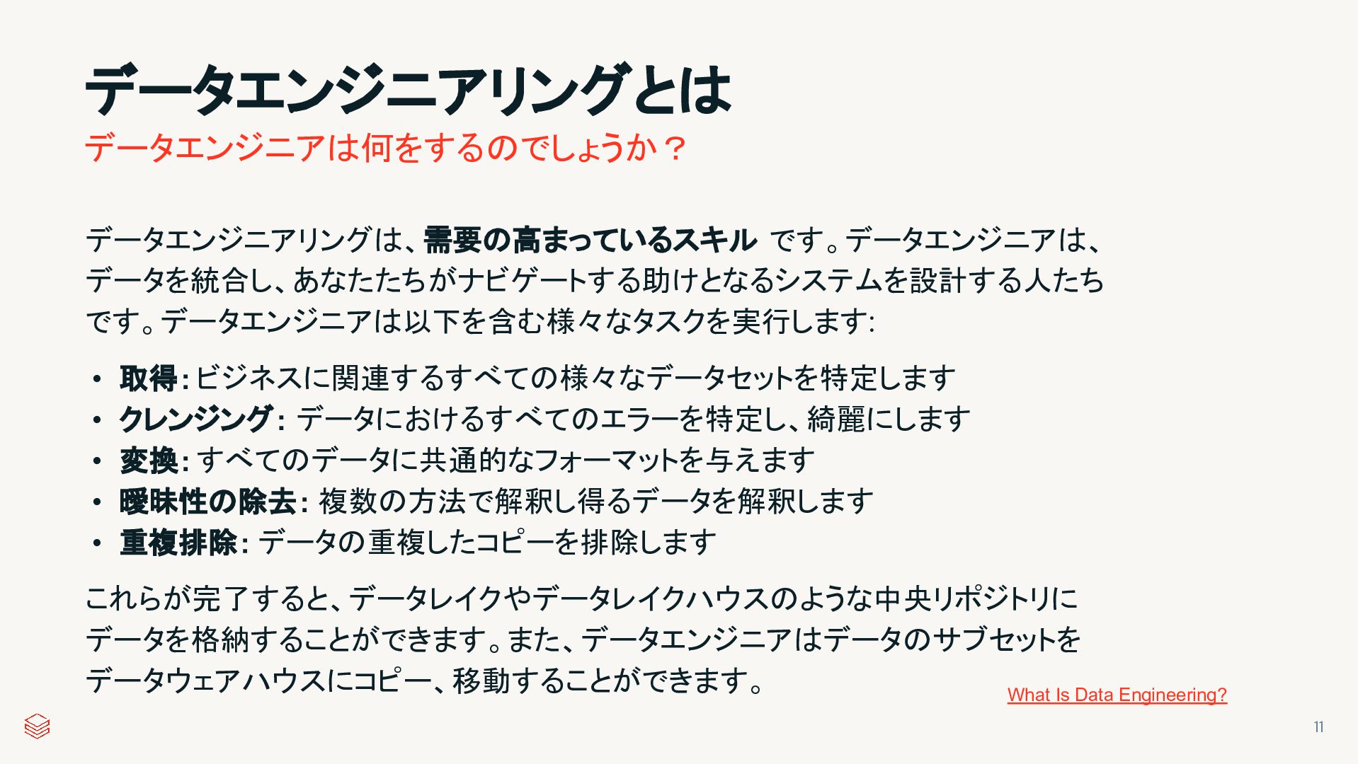 • 変換:すべてのデータに共通的なフォーマットを与えます • 曖昧性の除去: 複数の方法で解釈し得るデータを解釈します • 重複排除: データの重複したコピーを排除します これらが完了すると、データレイクやデータレイクハウスのような中央リポジトリに データを格納することができます。また、データエンジニアはデータのサブセットを データウェアハウスにコピー、移動することができます。 What Is Data Engineering? 11 データエンジニアは何をするのでしょうか?