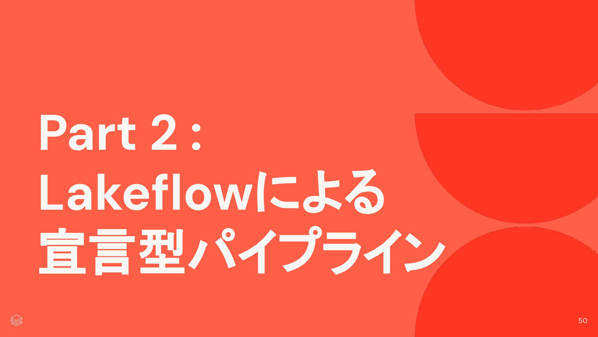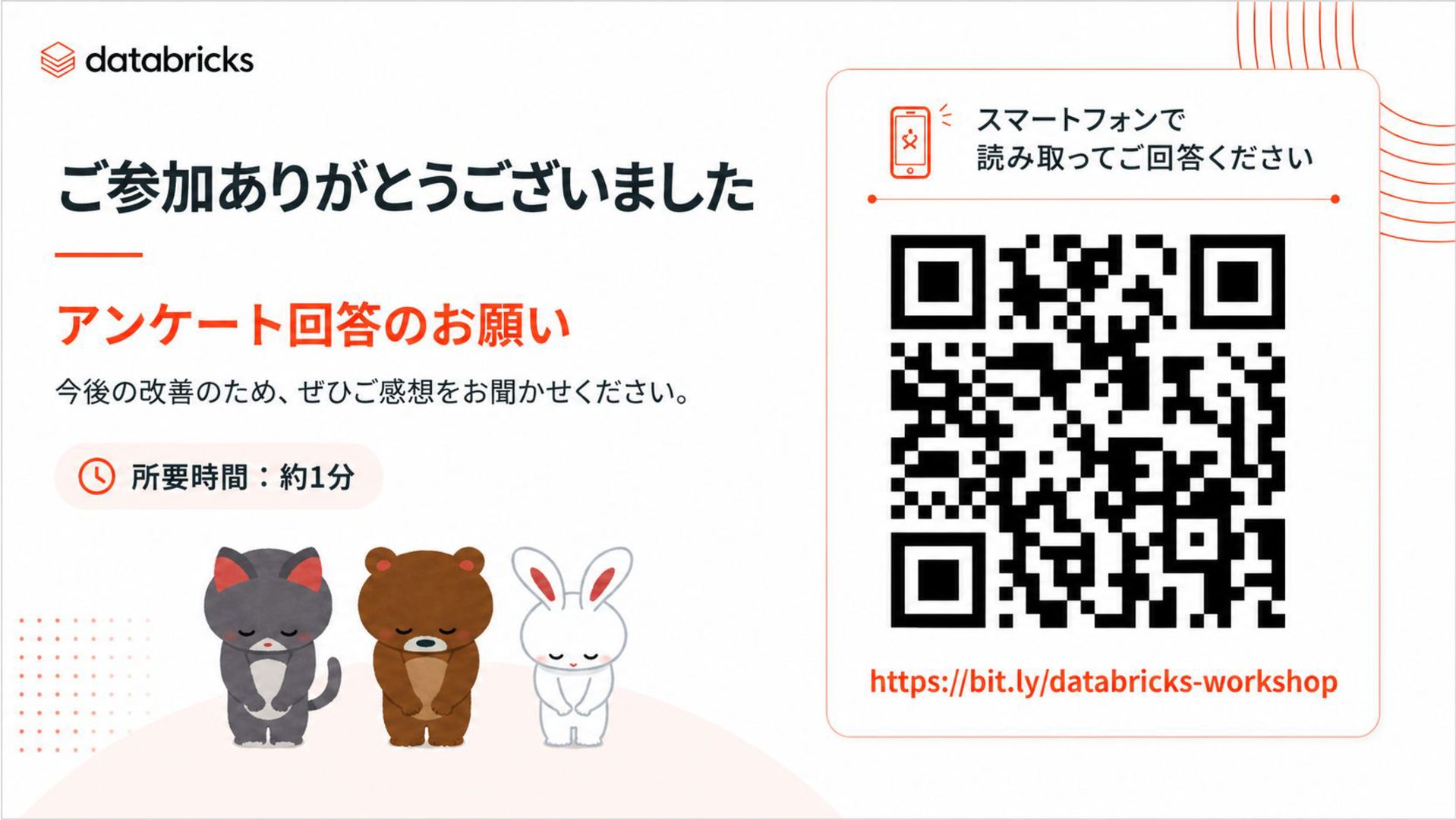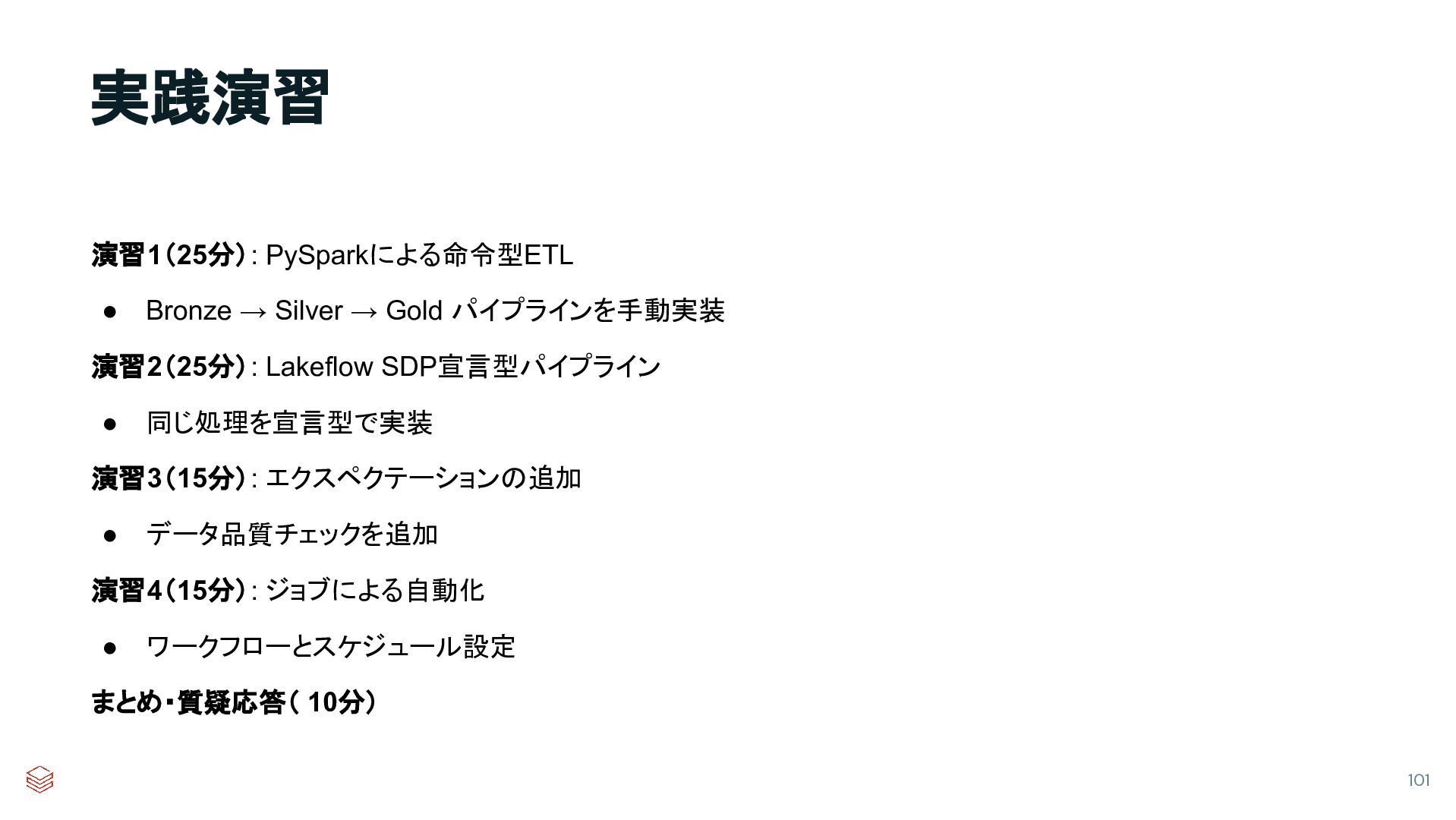パイプラインを手動実装 演習2(25分): Lakeflow SDP宣言型パイプライン • 同じ処理を宣言型で実装 演習3(15分): エクスペクテーションの追加 • データ品質チェックを追加 演習4(15分): ジョブによる自動化 • ワークフローとスケジュール設定 まとめ・質疑応答( 10分)