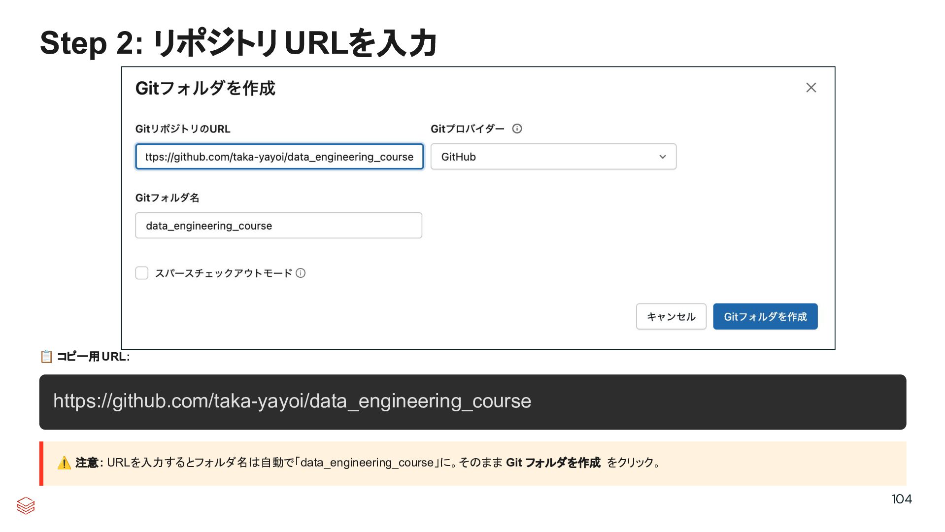 48. Step 3: ファイル構成を確認 クローン後のフォルダ構成: 📁 data_engineering_course/ ├── 📄 README.md ├──