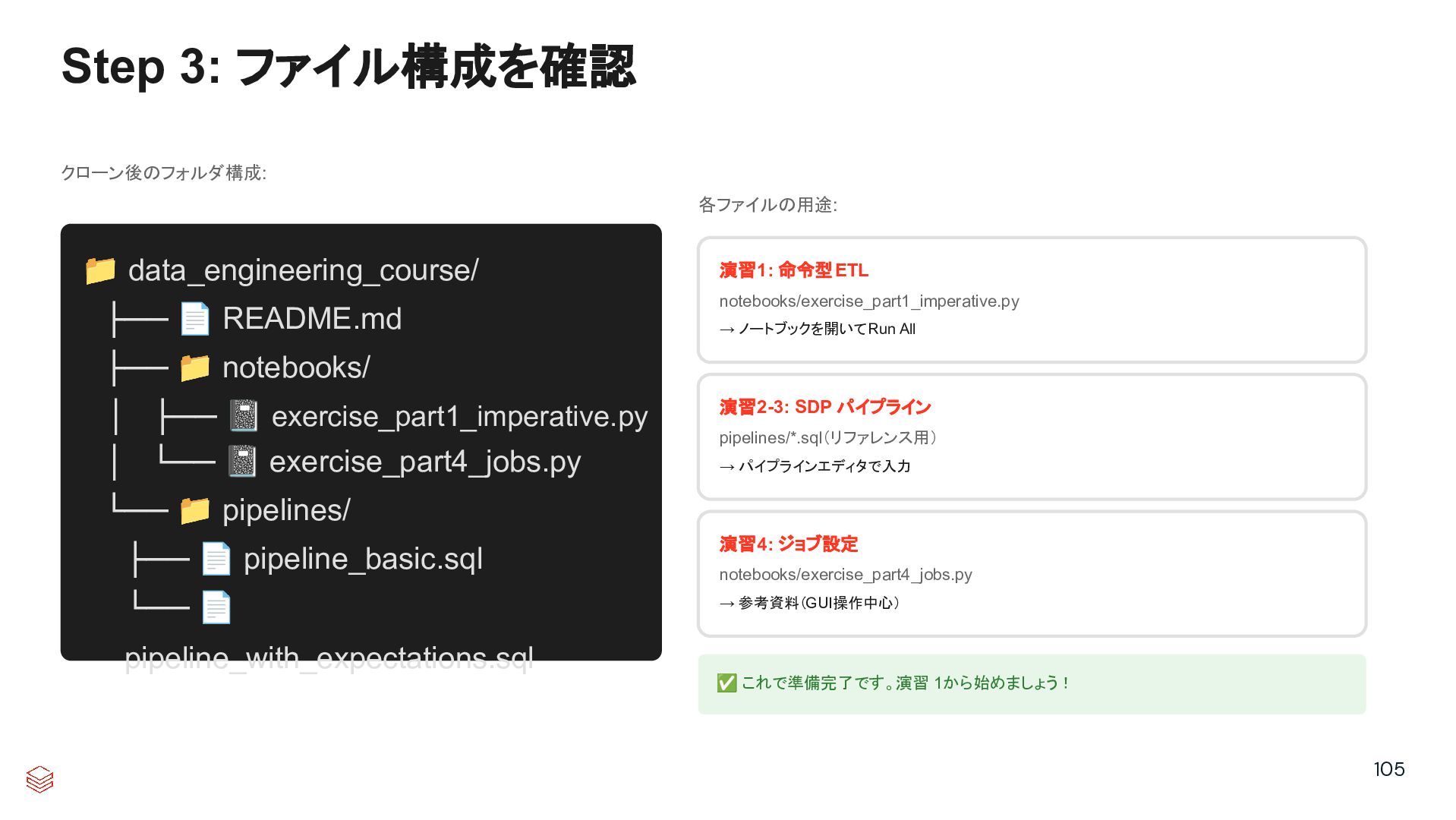📁 notebooks/ │ ├── 📓 exercise_part1_imperative.py │ └── 📓 exercise_part4_jobs.py └── 📁 pipelines/ ├── 📄 pipeline_basic.sql └── 📄 pipeline_with_expectations.sql 各ファイルの用途: 演習1: 命令型ETL notebooks/exercise_part1_imperative.py → ノートブックを開いて Run All 演習2-3: SDP パイプライン pipelines/*.sql(リファレンス用) → パイプラインエディタで入力 演習4: ジョブ設定 notebooks/exercise_part4_jobs.py → 参考資料(GUI操作中心) ✅ これで準備完了です。演習 1から始めましょう! 105