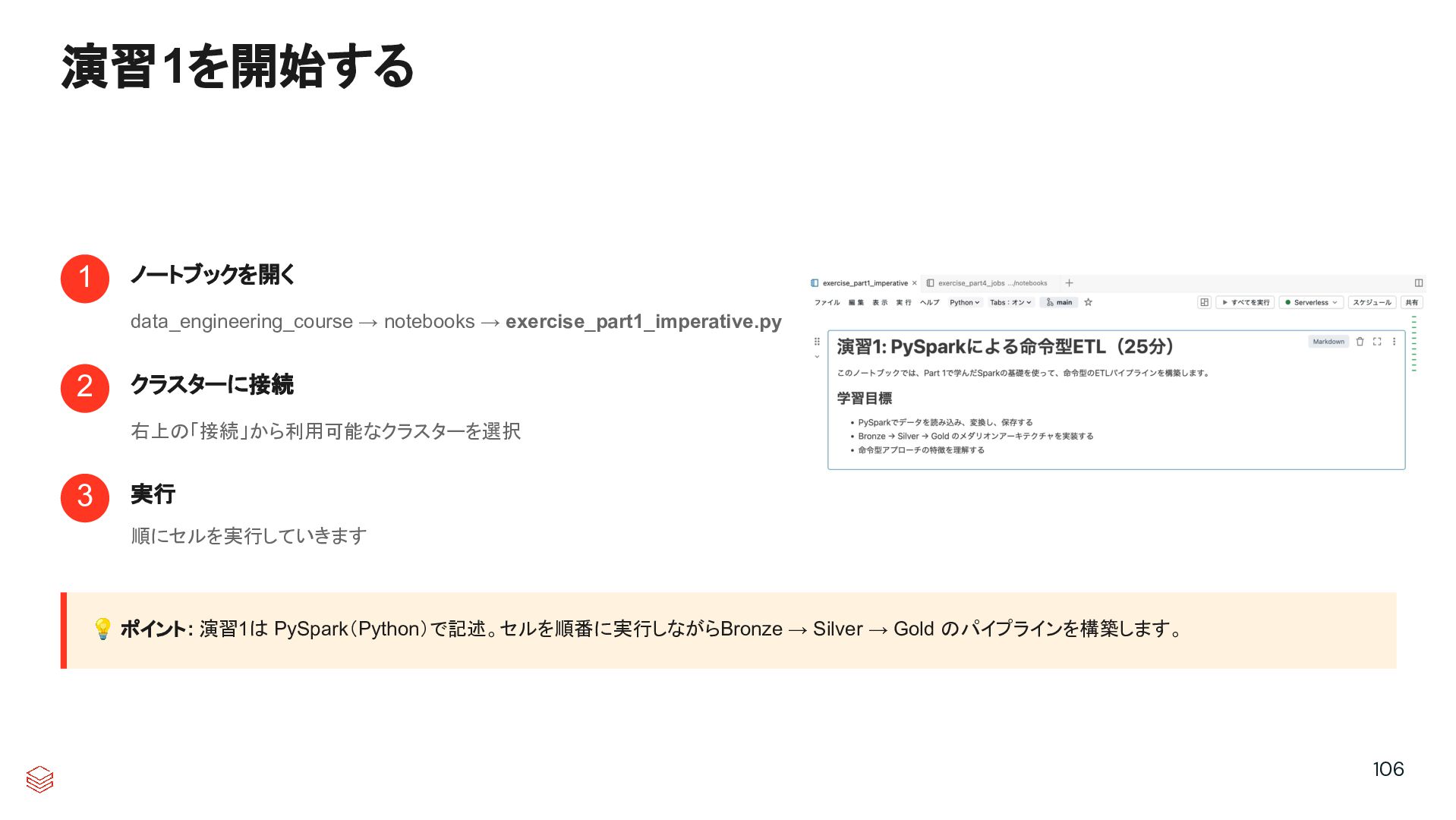 右上の「接続」から利用可能なクラスターを選択 3 実行 順にセルを実行していきます 💡 ポイント: 演習1は PySpark(Python)で記述。セルを順番に実行しながら Bronze → Silver → Gold のパイプラインを構築します。 106