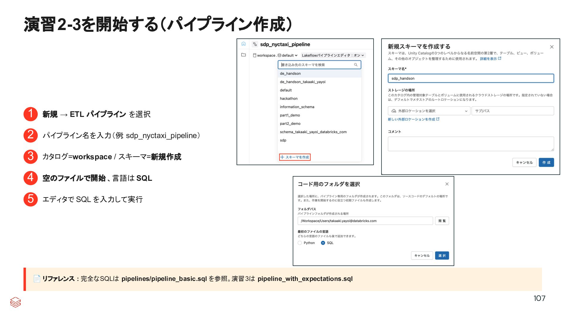 sdp_nyctaxi_pipeline) 3 カタログ=workspace / スキーマ=新規作成 4 空のファイルで開始、言語は SQL 5 エディタで SQL を入力して実行 📄 リファレンス : 完全なSQLは pipelines/pipeline_basic.sql を参照。演習3は pipeline_with_expectations.sql 107