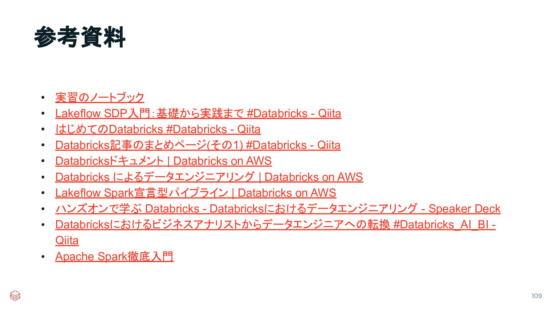 • はじめてのDatabricks #Databricks - Qiita • Databricks記事のまとめページ(その1) #Databricks - Qiita • Databricksドキュメント | Databricks on AWS • Databricks によるデータエンジニアリング | Databricks on AWS • Lakeflow Spark宣言型パイプライン | Databricks on AWS • ハンズオンで学ぶ Databricks - Databricksにおけるデータエンジニアリング - Speaker Deck • Databricksにおけるビジネスアナリストからデータエンジニアへの転換 #Databricks_AI_BI - Qiita • Apache Spark徹底入門