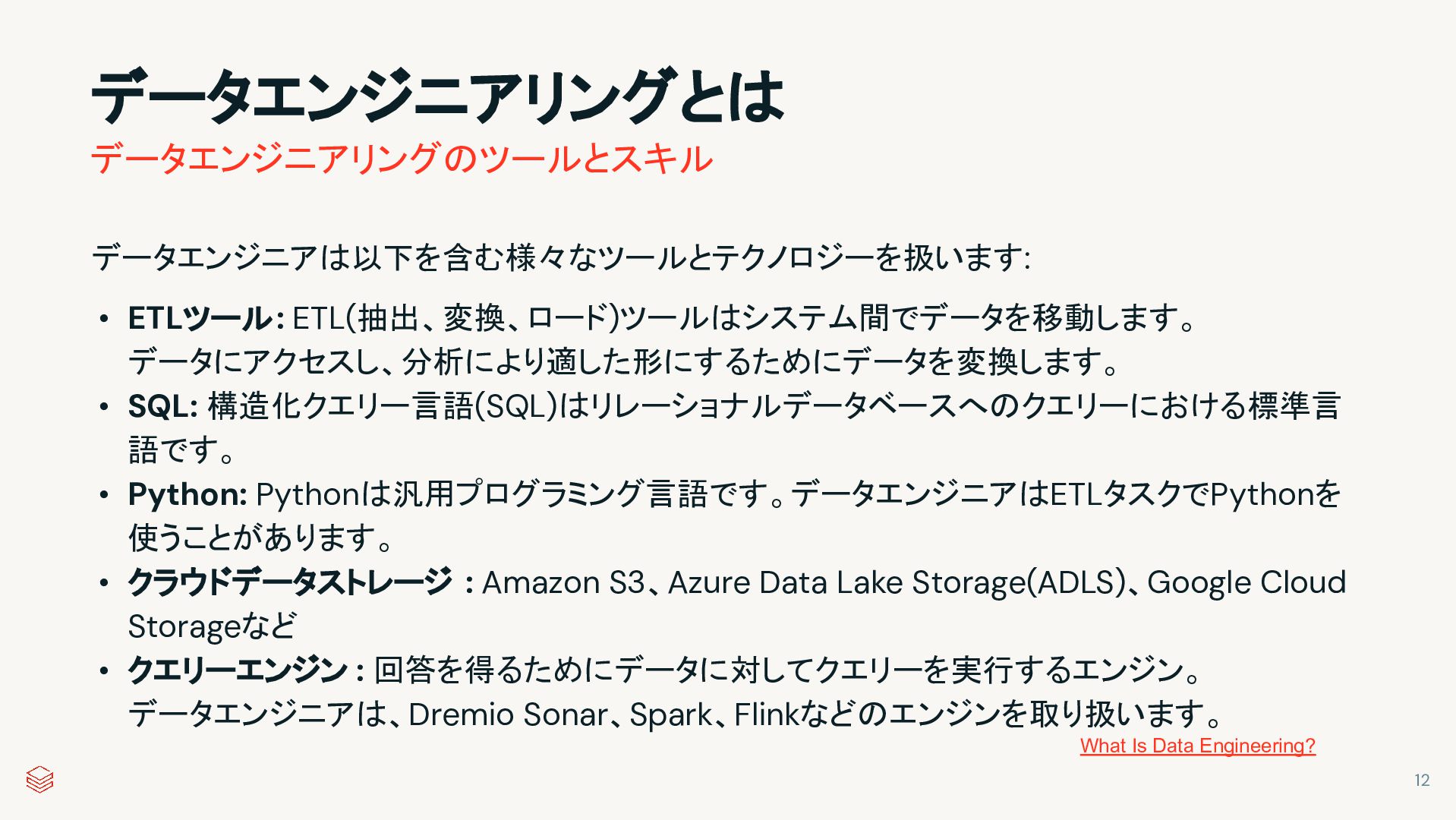 • Python: Pythonは汎用プログラミング言語です。データエンジニアはETLタスクでPythonを 使うことがあります。 • クラウドデータストレージ : Amazon S3、Azure Data Lake Storage(ADLS)、Google Cloud Storageなど • クエリーエンジン : 回答を得るためにデータに対してクエリーを実行するエンジン。 データエンジニアは、Dremio Sonar、Spark、Flinkなどのエンジンを取り扱います。 12 What Is Data Engineering? データエンジニアリングのツールとスキル
