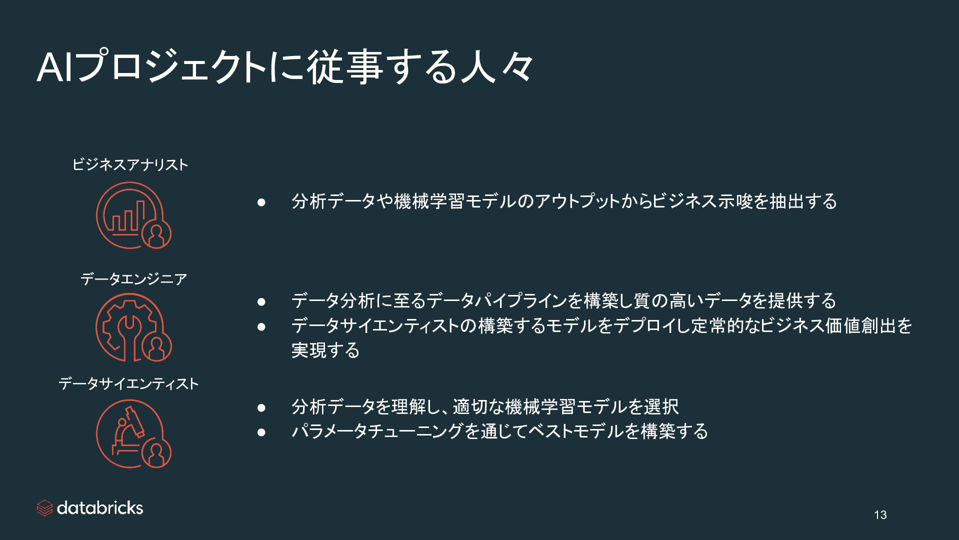 3 ダッシュボードと自然言語分析によるインサイト導出 4 実践演習 データエンジニア編 5 Sparkを用いた大規模データ加工 6 パイプラインの構築 7 実践演習 データサイエンティスト編 ①機械学習 8 ノートブックによるモデル開発実践 (SparkMLを活用) 9 MLOpsによる業務品質のモデル開発サイクル 10 実践演習 データサイエンティスト編 ②大規模言語モデル 11 大規模言語モデル(LLM)の理論と実践 12 AIエージェントの理論と実践(LLMOps含む) 13 実践演習