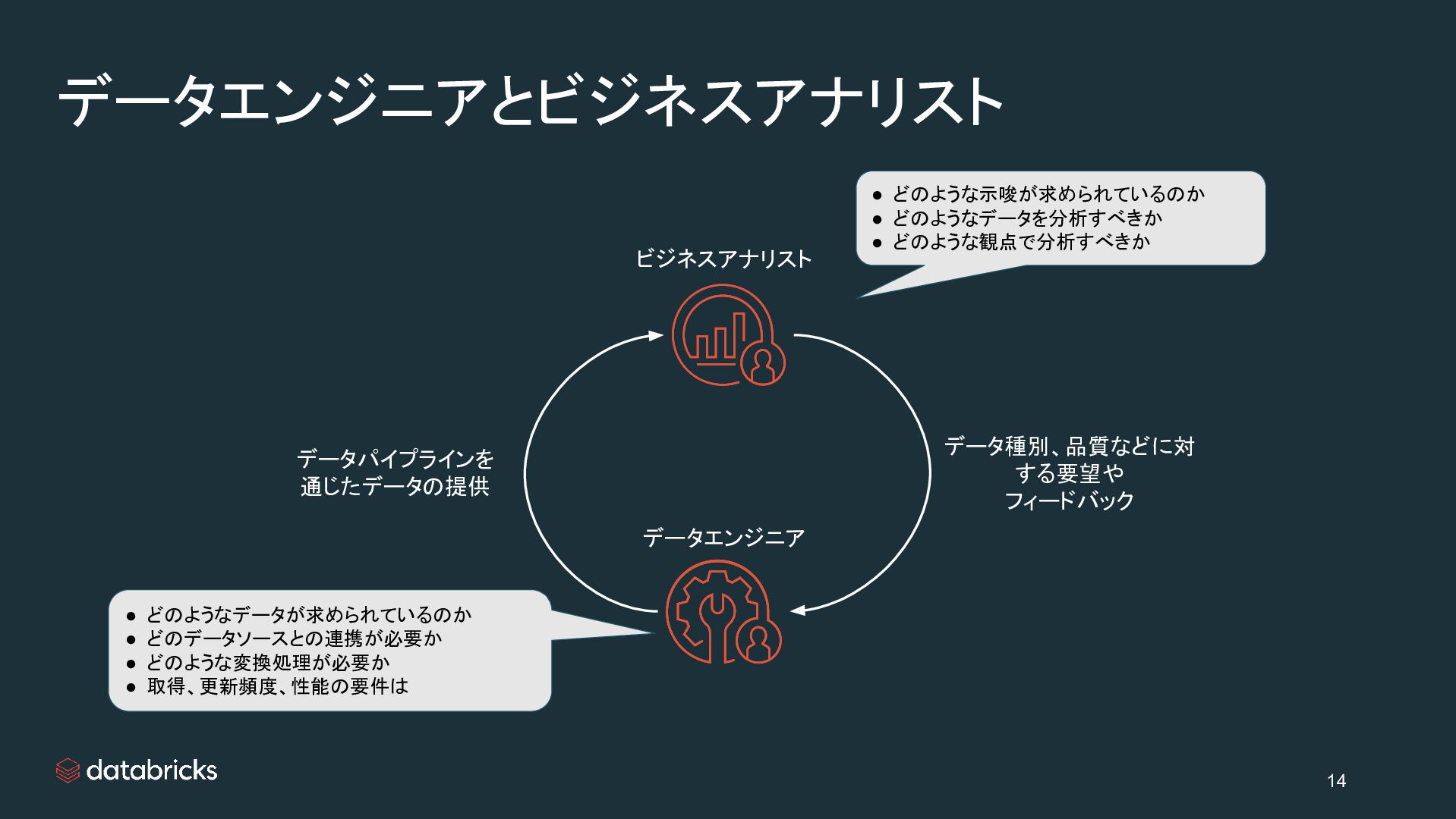 どのようなデータが求められているのか • どのデータソースとの連携が必要か • どのような変換処理が必要か • 取得、更新頻度、性能の要件は データパイプラインを 通じたデータの提供 データ種別、品質などに対 する要望や フィードバック データエンジニアとビジネスアナリスト
