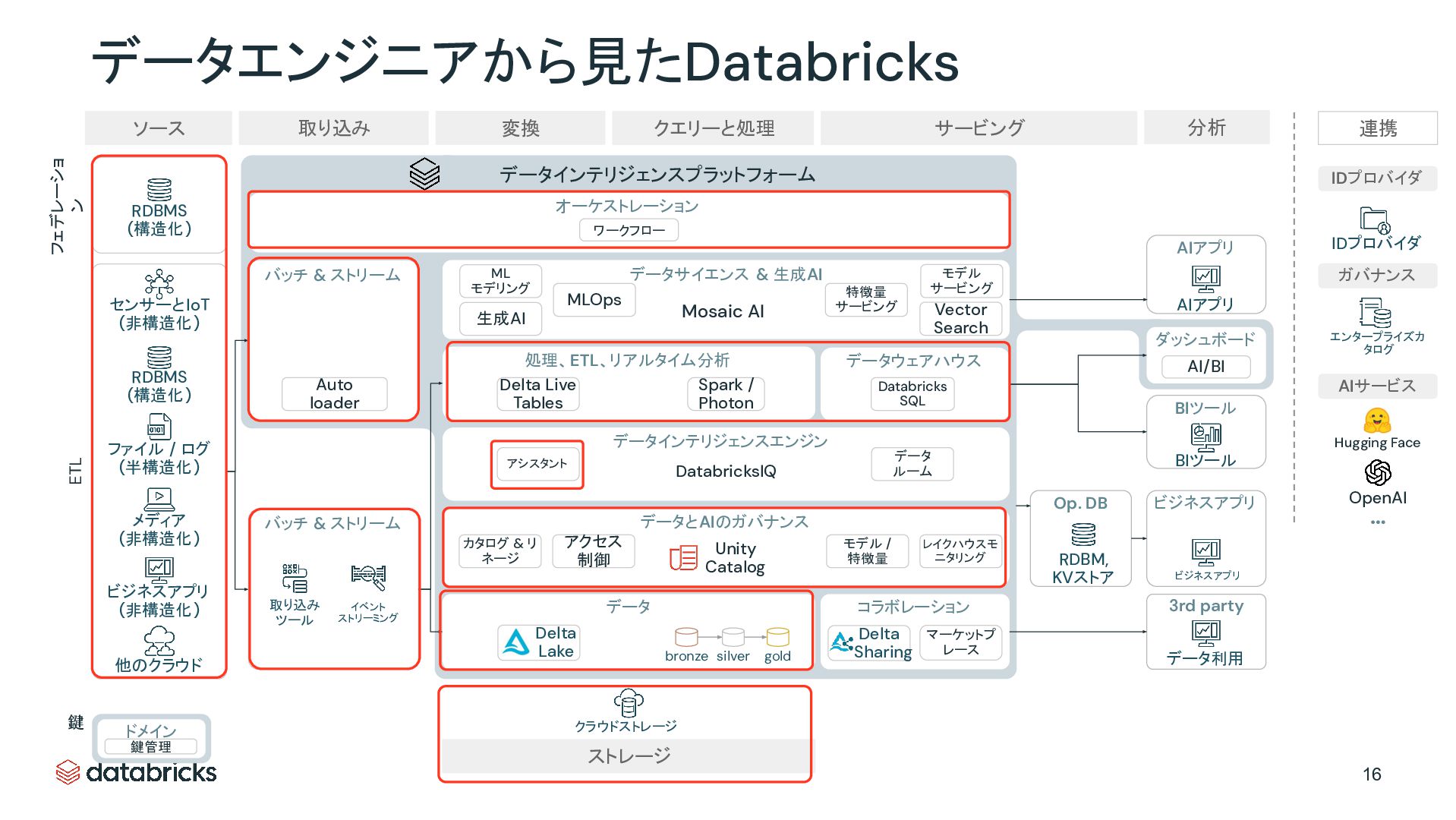 データサイエンス & 生成AI 処理、ETL、リアルタイム分析 オーケストレーション データとAIのガバナンス バッチ & ストリーム データウェアハウス データインテリジェンスエンジン データインテリジェンスプラットフォーム フェデレーショ ン ETL AIアプリ 3rd party ビジネスアプリ 連携 取り込み 変換 分析 ソース サービング クエリーと処理 ダッシュボード Spark / Photon Delta Live Tables Databricks SQL ワークフロー Auto loader マーケットプ レース アシスタント データ ルーム AI/BI レイクハウスモ ニタリング Hugging Face OpenAI IDプロバイダ ガバナンス AIサービス モデル サービング Vector Search ML モデリング Mosaic AI カタログ & リ ネージ アクセス 制御 Unity Catalog MLOps 生成AI 特徴量 サービング … ドメイン 鍵管理 鍵 モデル / 特徴量 DatabricksIQ センサーとIoT (非構造化) RDBMS (構造化) ビジネスアプリ (非構造化) メディア (非構造化) 他のクラウド ビジネスアプリ ファイル / ログ (半構造化) IDプロバイダ エンタープライズカ タログ クラウドストレージ AIアプリ RDBMS (構造化) 取り込み ツール イベント ストリーミング RDBM, KVストア データ利用 BIツール Delta Lake Delta Sharing bronze silver gold 15