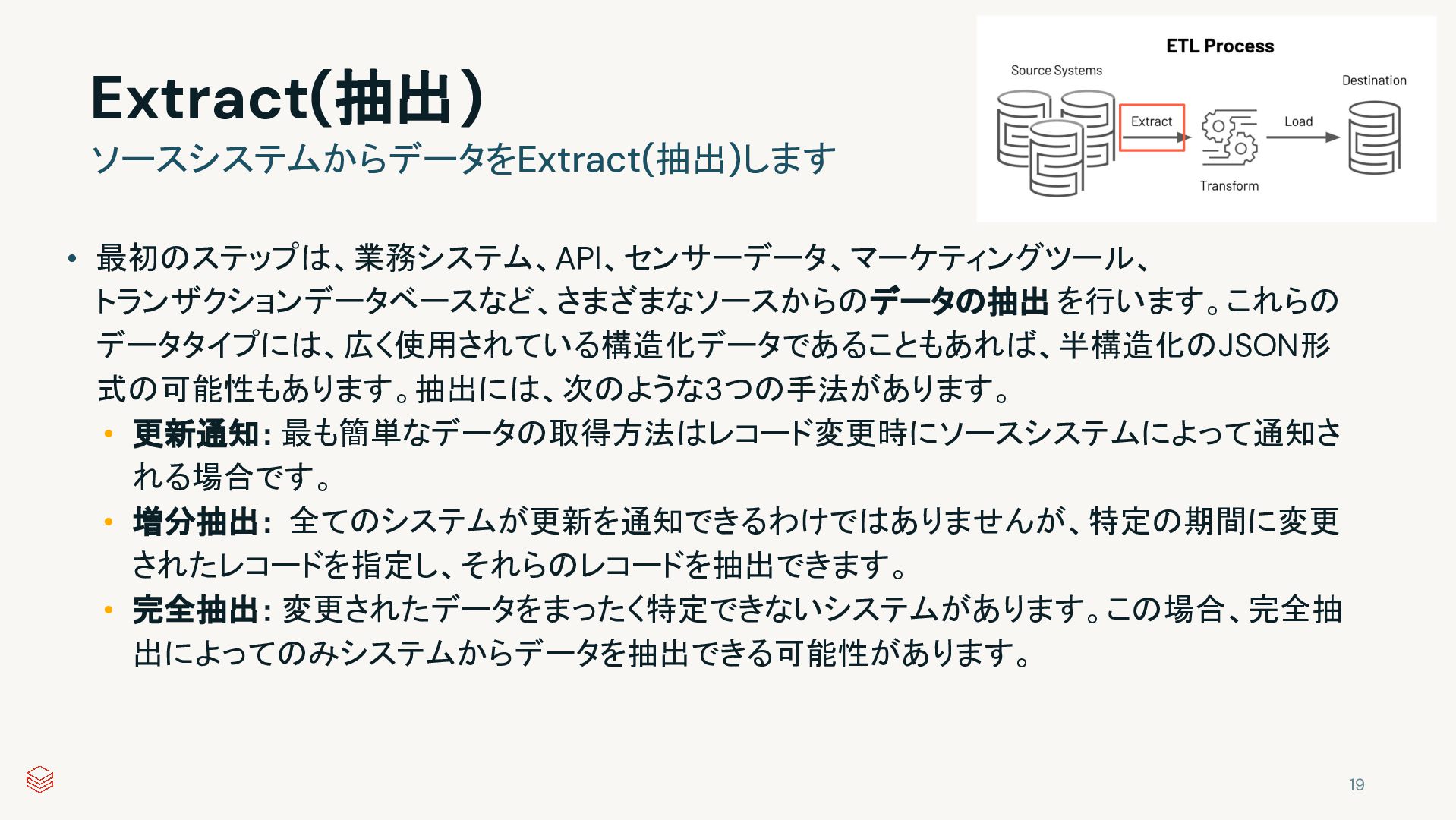 12. Extract(抽出) ソースシステムからデータをExtract(抽出)します 19 • 最初のステップは、業務システム、API、センサーデータ、マーケティングツール、 トランザクションデータベースなど、さまざまなソースからのデータの抽出 を行います。これらの データタイプには、広く使用されている構造化データであることもあれば、半構造化のJSON形 式の可能性もあります。抽出には、次のような3つの手法があります。 •