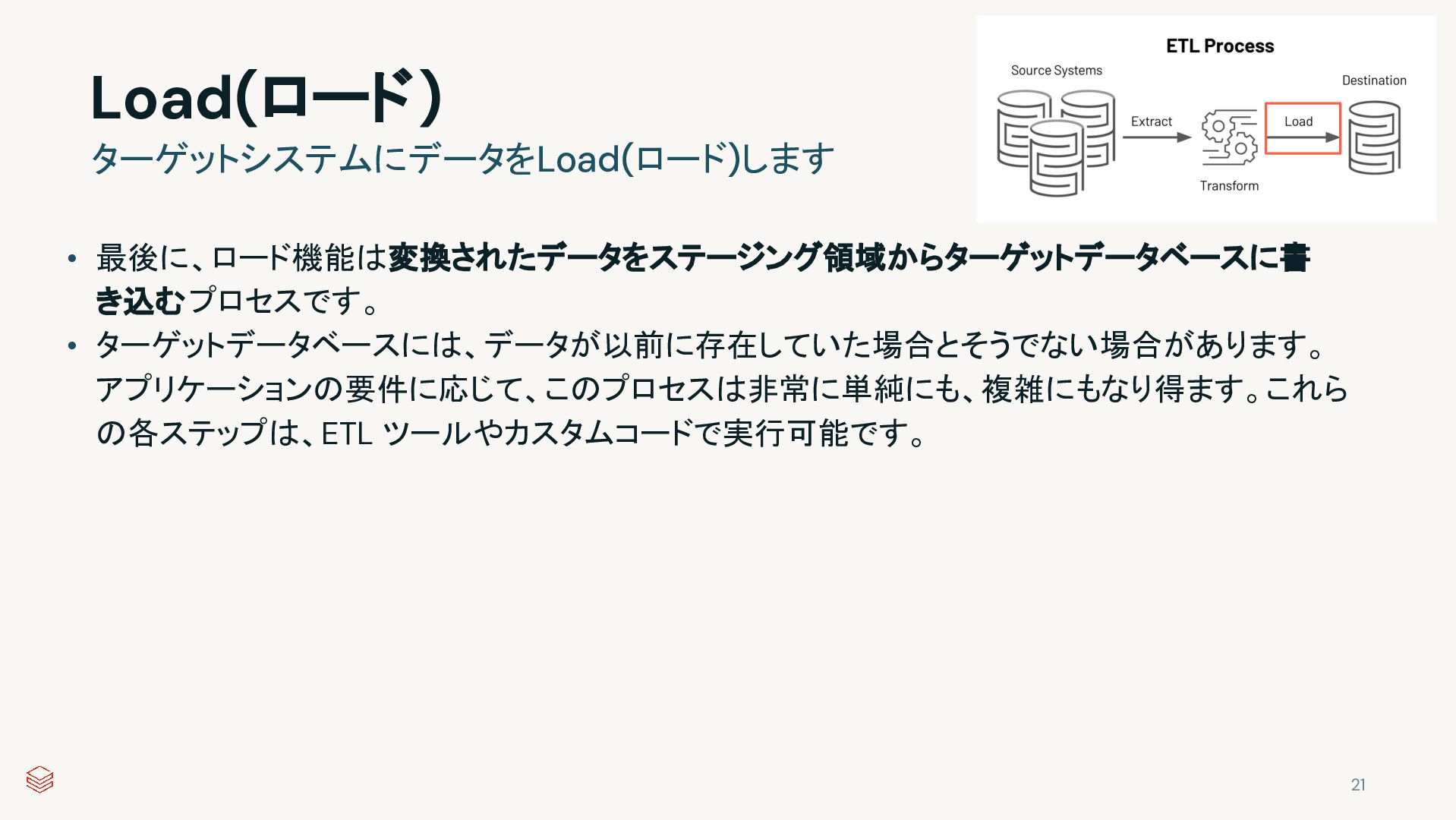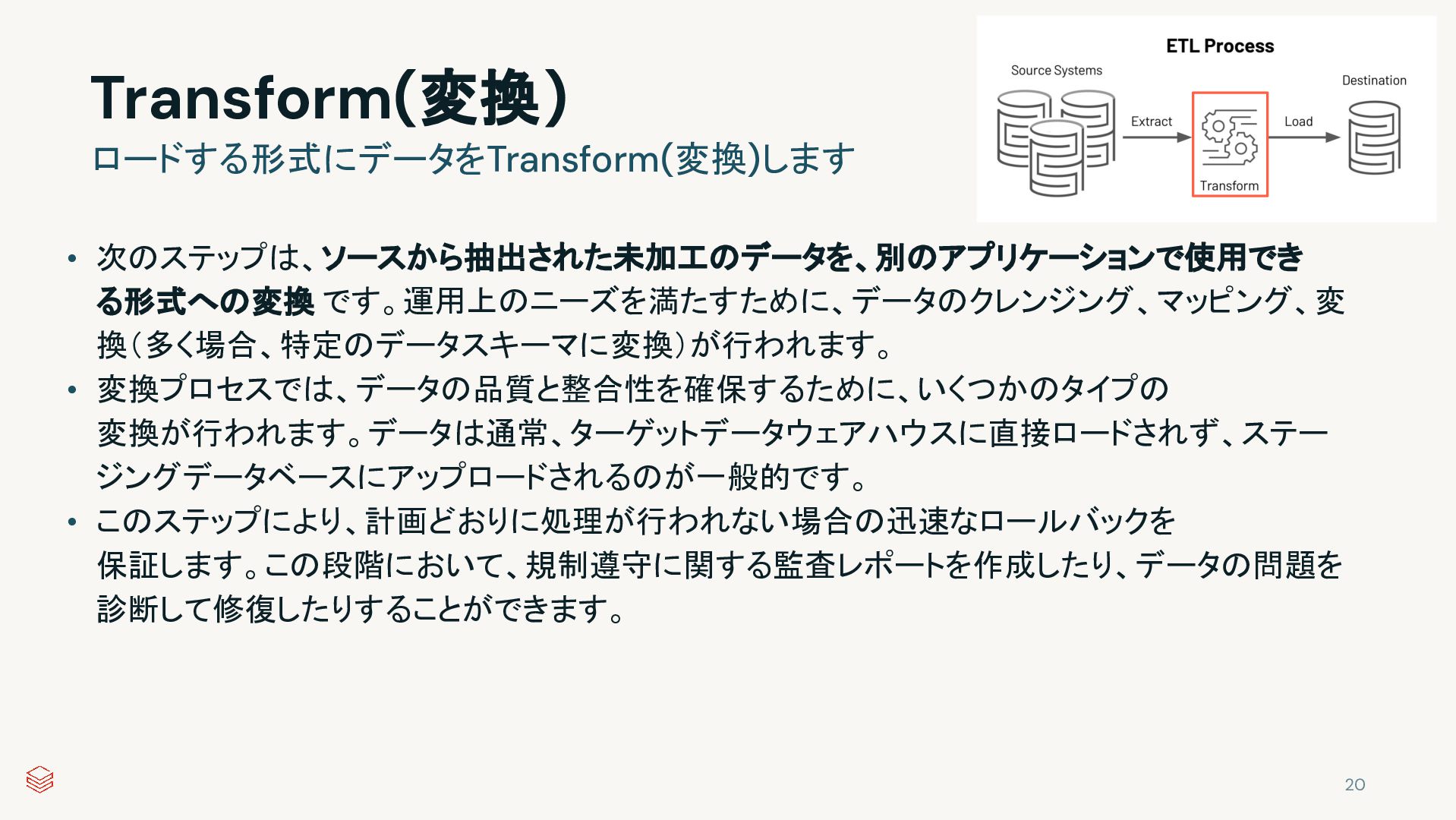 13. Transform(変換) ロードする形式にデータをTransform(変換)します 20 • 次のステップは、ソースから抽出された未加工のデータを、別のアプリケーションで使用でき る形式への変換 です。運用上のニーズを満たすために、データのクレンジング、マッピング、変 換(多く場合、特定のデータスキーマに変換)が行われます。 • 変換プロセスでは、データの品質と整合性を確保するために、いくつかのタイプの