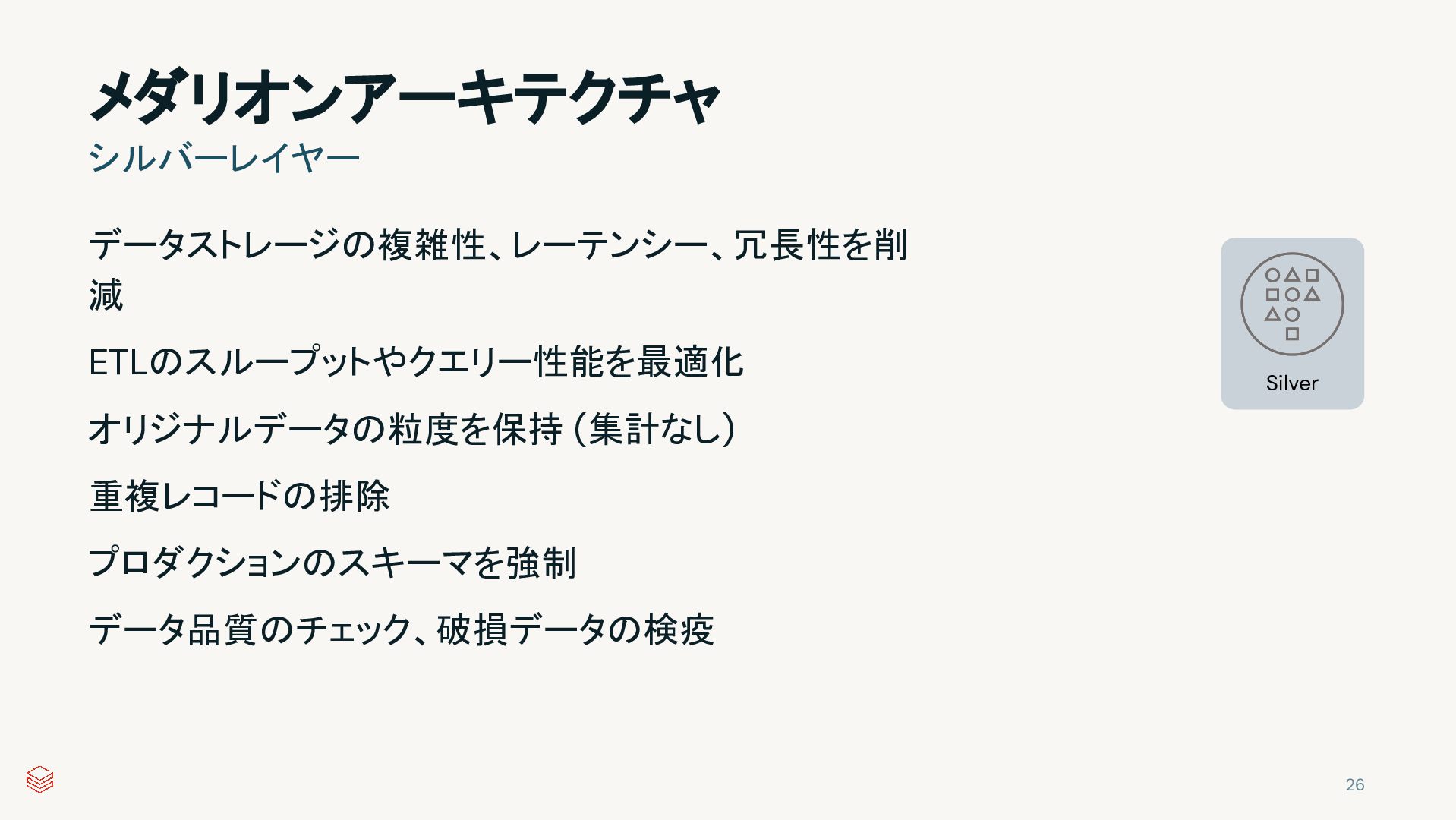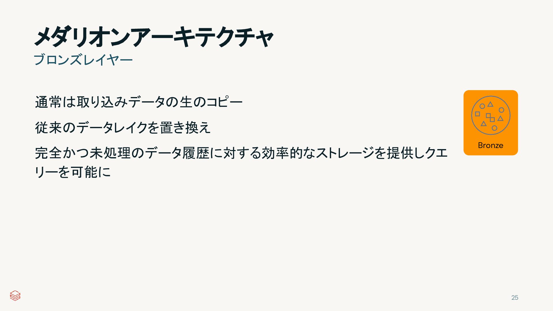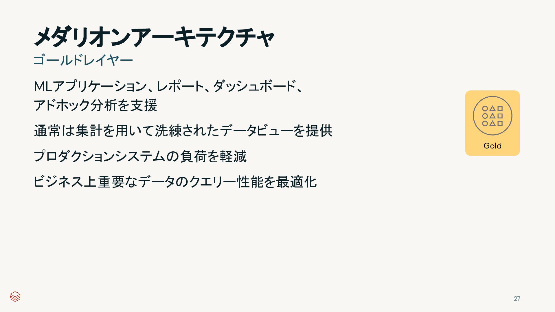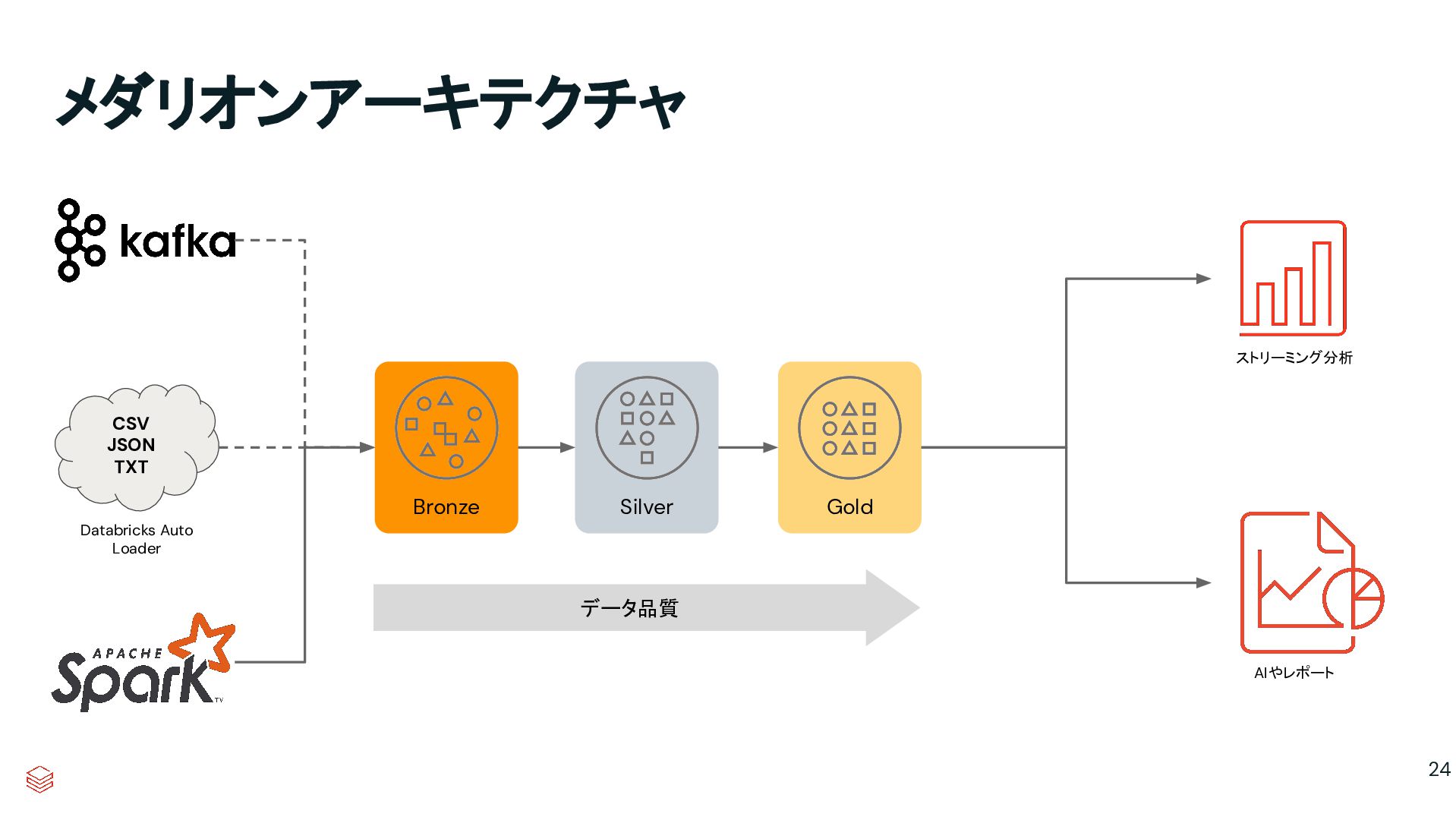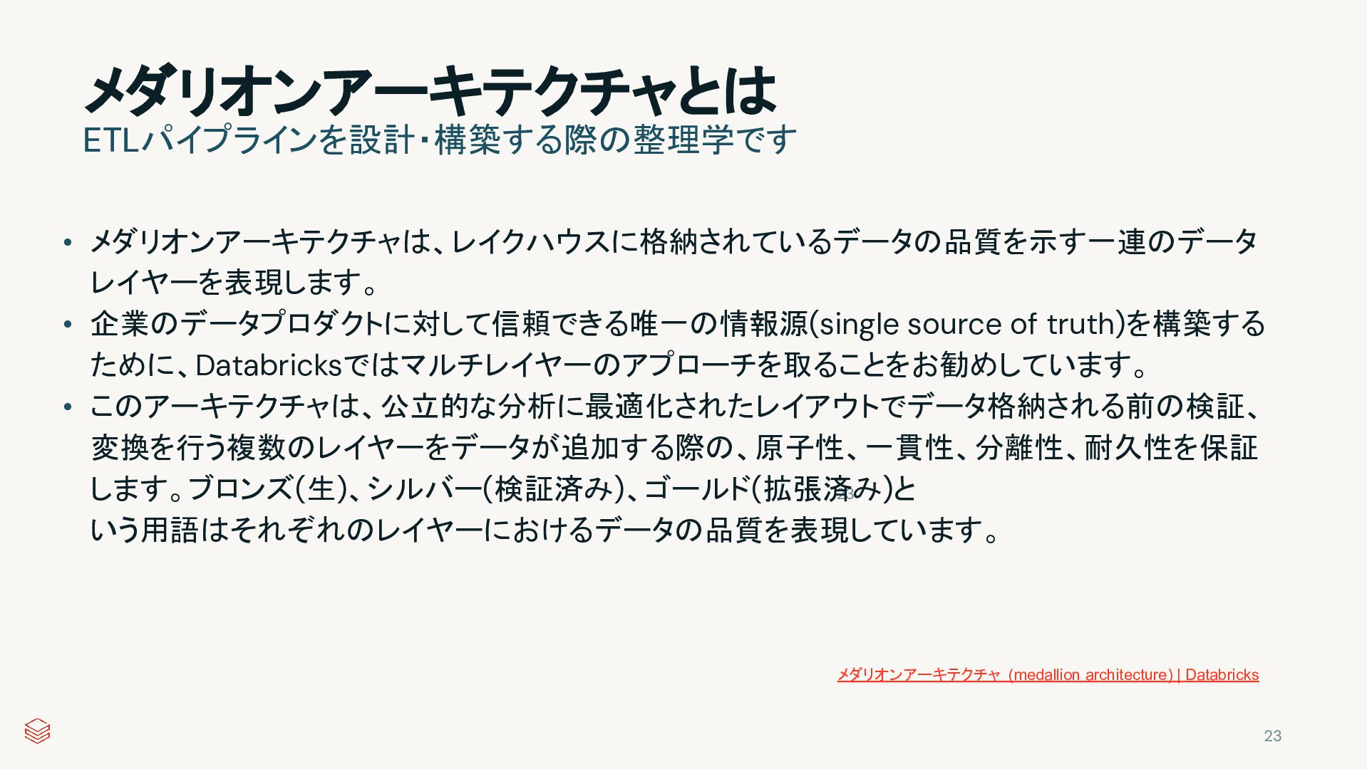 truth)を構築する ために、Databricksではマルチレイヤーのアプローチを取ることをお勧めしています。 • このアーキテクチャは、公立的な分析に最適化されたレイアウトでデータ格納される前の検証、 変換を行う複数のレイヤーをデータが追加する際の、原子性、一貫性、分離性、耐久性を保証 します。ブロンズ(生)、シルバー(検証済み)、ゴールド(拡張済み)と いう用語はそれぞれのレイヤーにおけるデータの品質を表現しています。 23 メダリオンアーキテクチャ (medallion architecture) | Databricks